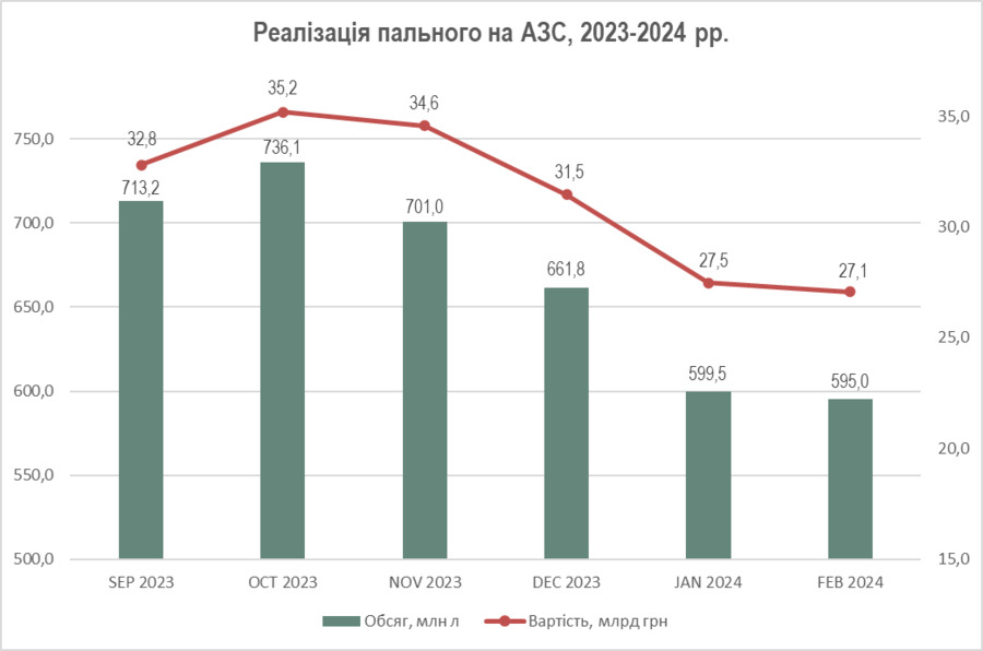 У порівнянні з осіннім періодом, обсяги продажів взимку суттєво скоротилися: з 713,2 млн л у вересні до 595,0 млн л у лютому (-16,6%). Зменшилися і доходи, з 32,8 млрд грн до 27,1 млрд грн (-17,4%).