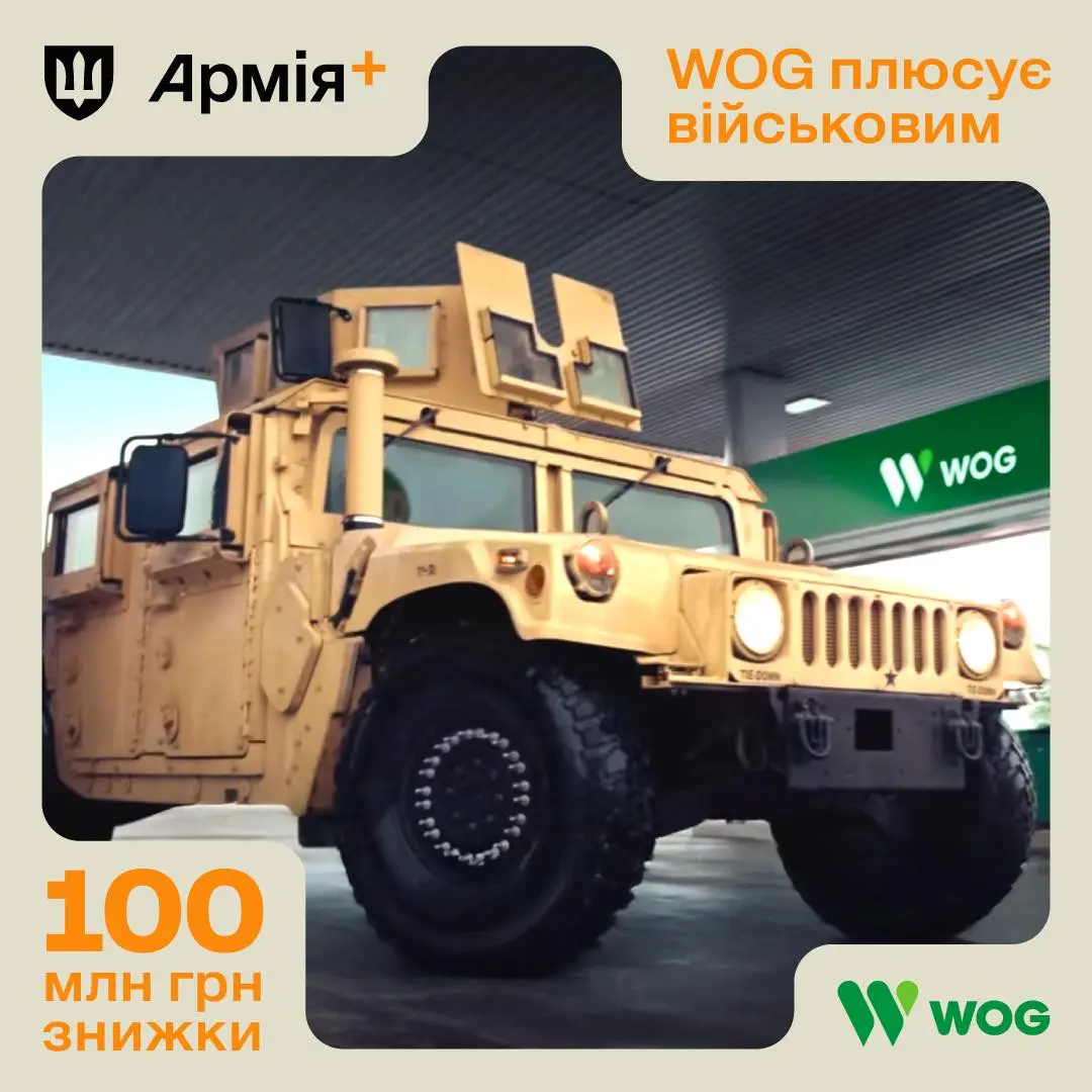 Мережа автозаправних комплексів WOG надала військовим понад 100 мільйонів гривень знижок у межах національної програми «Плюси» через застосунок «Армія+». Захисники можуть скористатися знижками при купівлі пального, страв і напоїв у WOG Cafe, а також товарів у WOG Market.