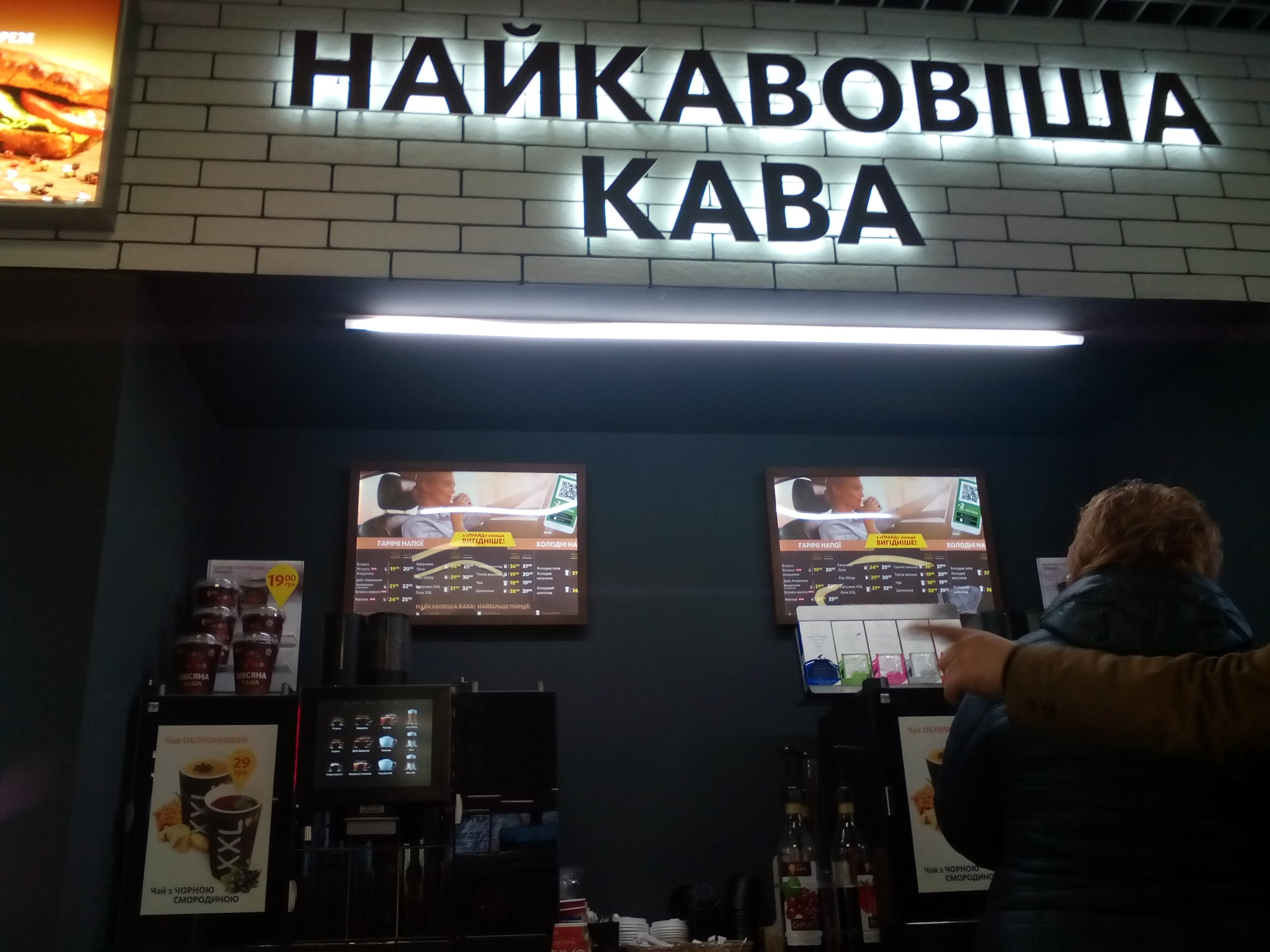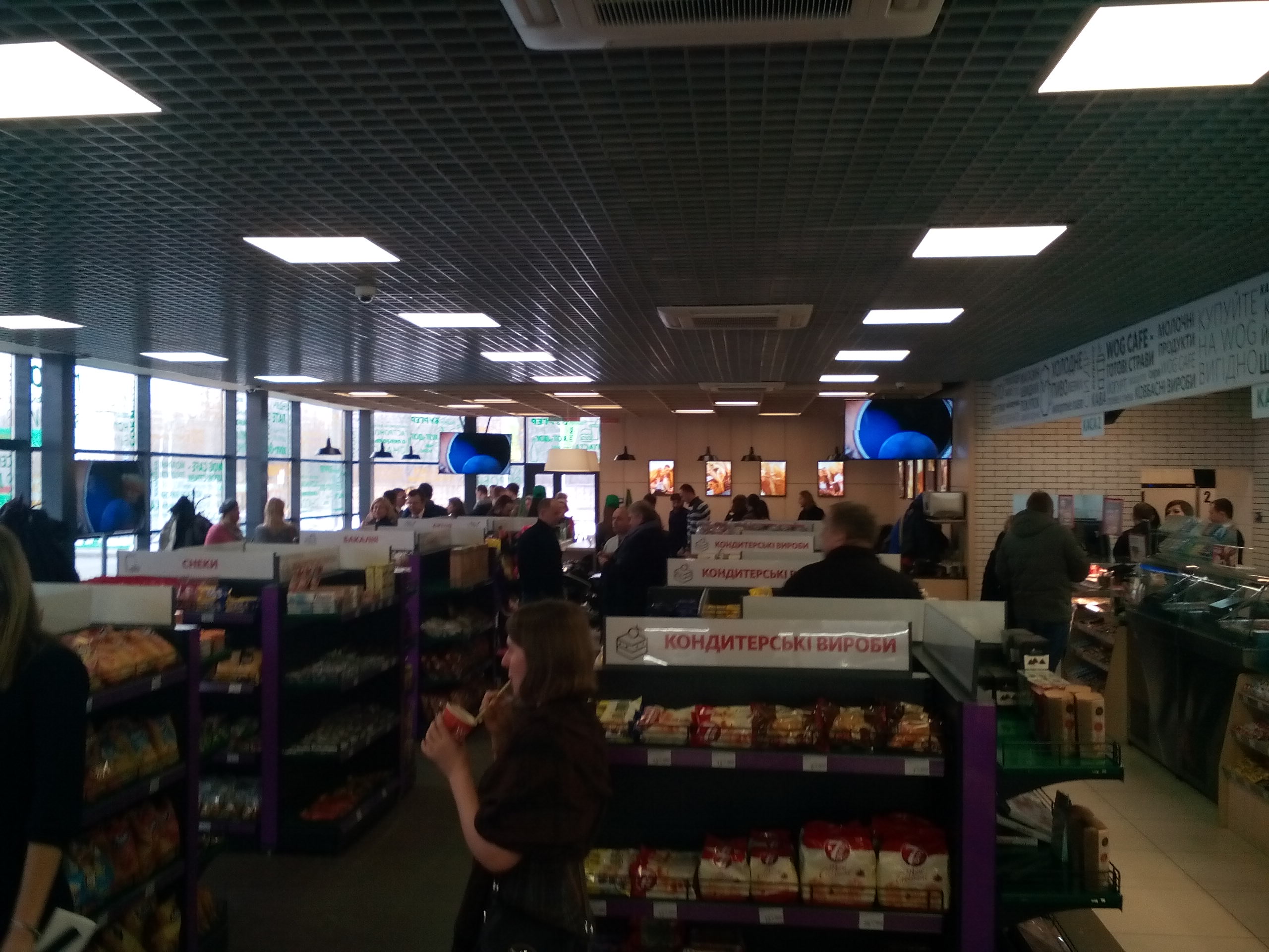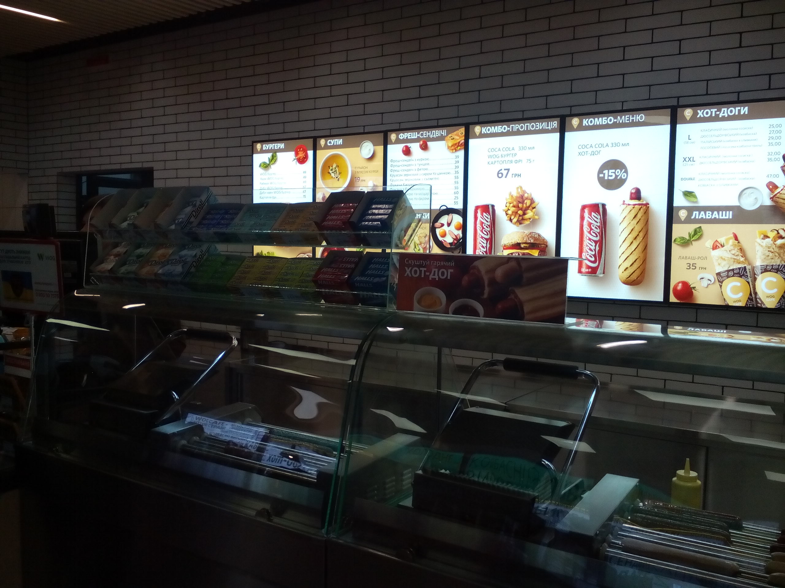 В просторном WOGCafé клиенту предлагается фирменный кофе и хот-доги, а также есть меню супов и салатов.