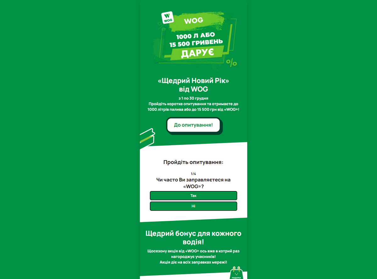 В тоже время на сайте, имя которого также имеет название wog, но с другим доменом, предлагается пройти опросник из четырех пунктов и в результате получить до 1000 л топлива или до 15500 грн.