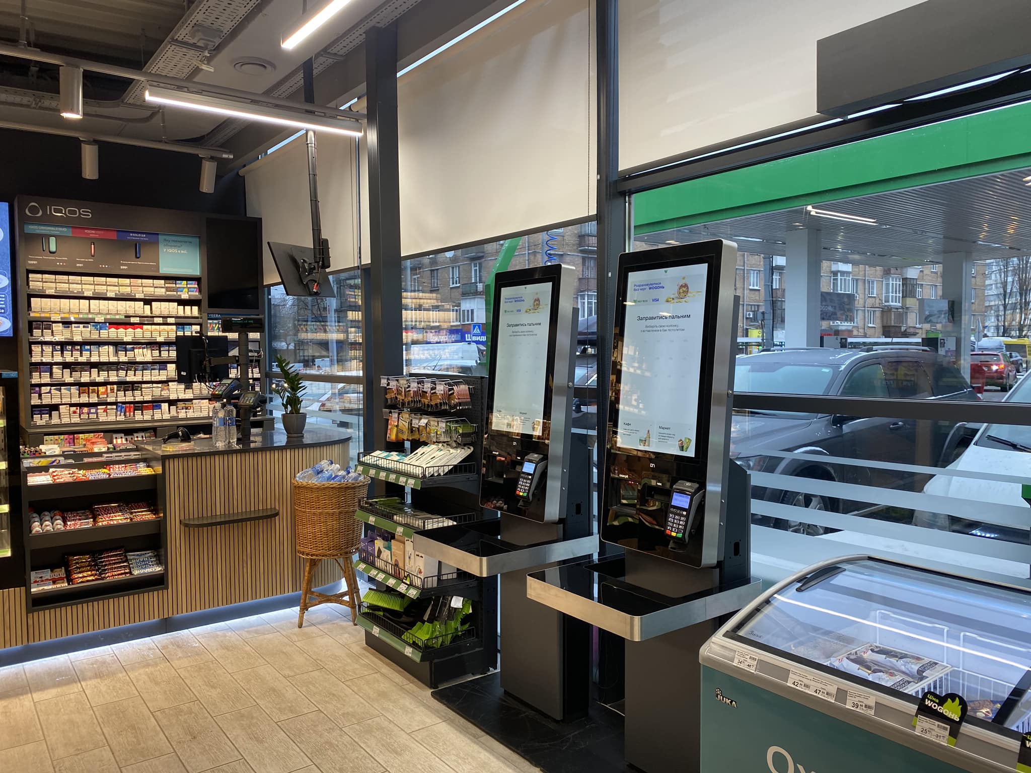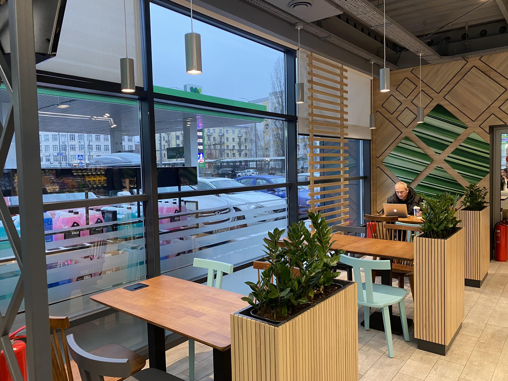 На станції є зручна зона кафе зі столиками для повноцінного обіду, в які інтегровані подовжувачі та зарядні пристрої для одразу трьох типів гаджетів. Одразу на вході знаходиться багатофункціональний кавовий острів. Окрім того, під одним дахом з АЗК знаходиться ресторан швидкого харчування KFC.