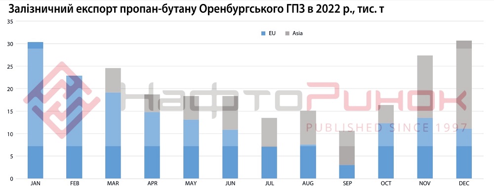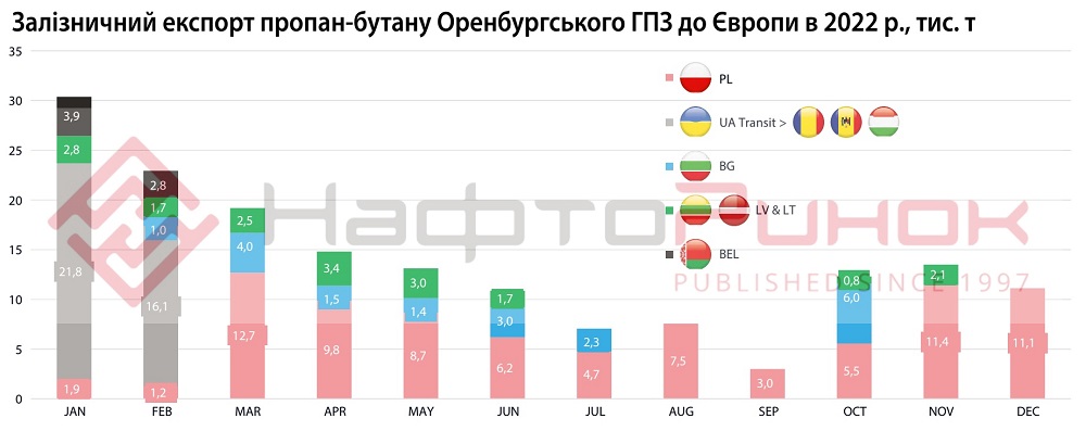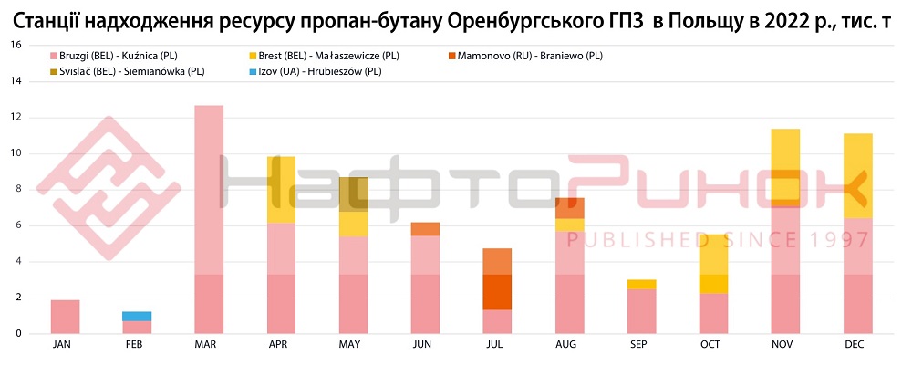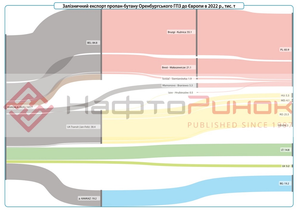 За даними логістичних компаній, в 2022 році зі станції відвантаження Оренбургського ГПЗ «Газпром переробка» – ст. Каргала, на експорт в Польщу було відвантажено 83,9 тис. т LPG. Транзитом через білорусь в Польщу потрапило 78,1 тис. т. З них найбільшою точкою входу в країну є залізничний перехід Брузгі (Білорусь) – Кузніца (Польща) – 57,7 тис. т. Також, 21,1 тис. т зайшло через перехід Брест-Малашевичі. Ще 5,3 тис. т перетнуло кордон Польщі з Калінінградською областю рф.