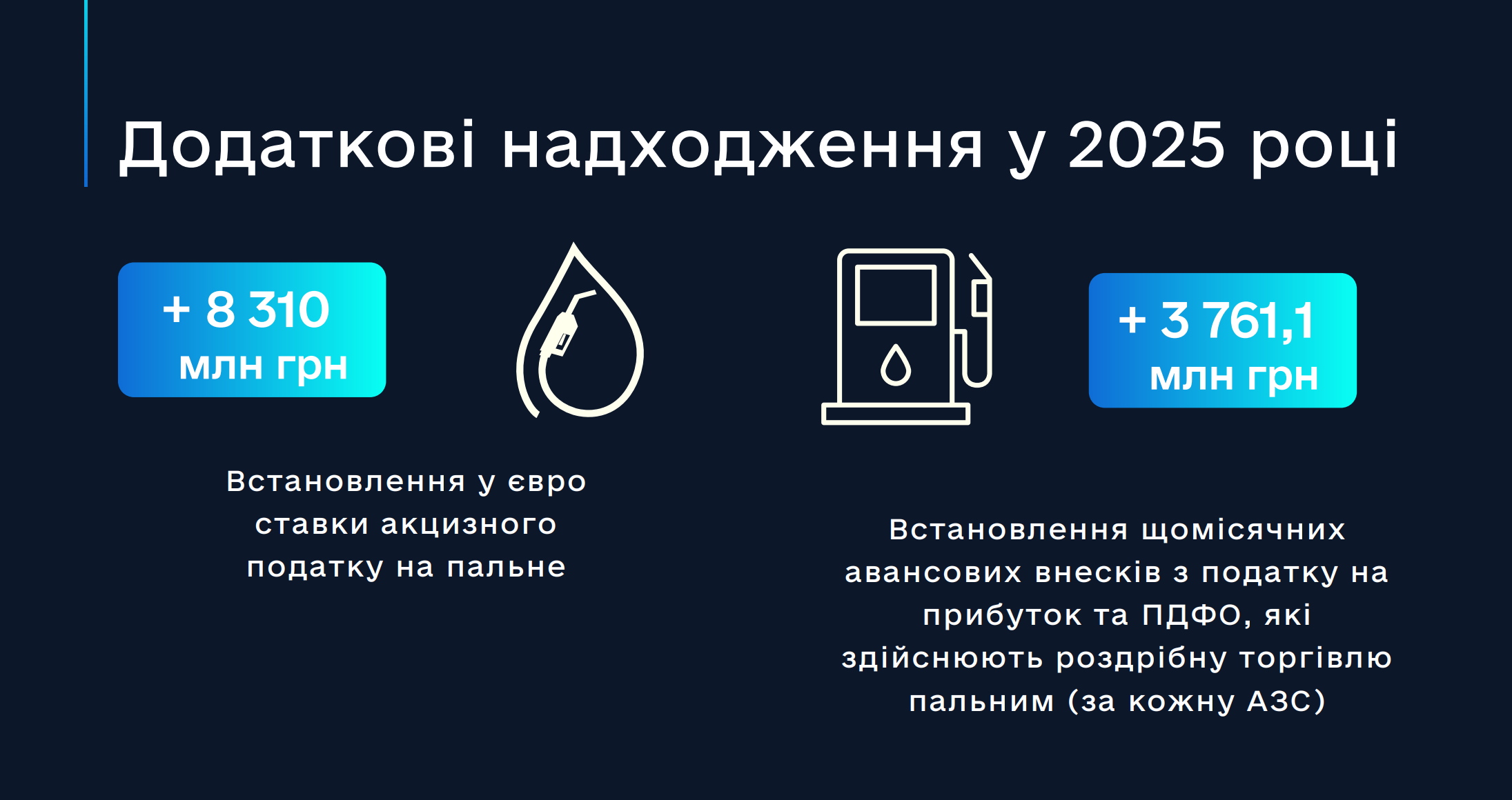 ДПС у своїй презентації «Ефект законодавчих ініціатив та очікування 2025 року» оптимістично прогнозує додаткові 3 761,1 млн грн до бюджету завдяки щомісячним авансовим внескам з податку на прибуток і ПДФО. Певно, це за умови, що збережеться та кількість місць роздрібної торгівлі пальним, яка є зараз. Хоча вже зараз є сумніви, адже малі мережі та АГЗС змушені закриватися через низьку рентабельність.