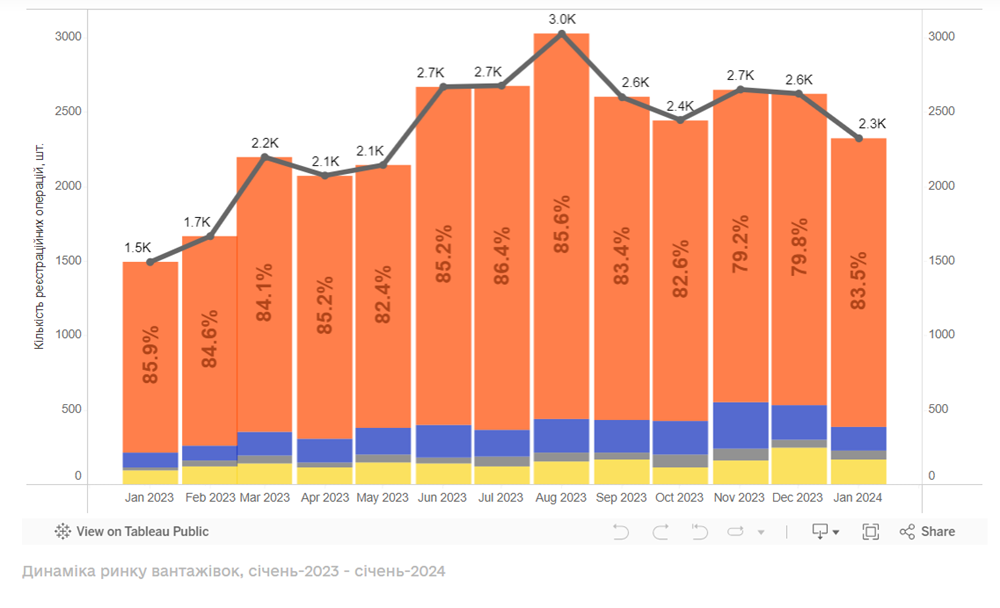 У січні українські перевізники придбали сумарно 2,3 тис. вантажівок повною масою понад 3,5 тонни. Це на 55,7% більше, ніж за аналогічний період минулого року, але на 11,4% менше, ніж у грудні 2023-го. Про це повідомляє Інститут досліджень авторинку (ІДА) з посиланням на власний аналіз даних МВС.