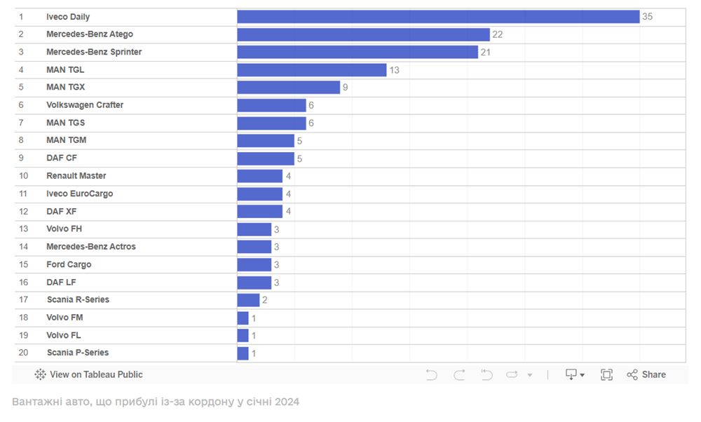 Найчастіше з-за кордону у січні привозили фургони з гідробортом (33 од.), фургони (21 од.), бортові тентовані (19 од.), контейнеровози (12 од.), та платформи (10 од.). Серед окремих моделей вантажівок з повною масою понад 3,5 т у найбільшій кількості український автопарк поповнили Iveco Daily (35 од.), на другій позиції — Mercedes-Benz Atego (22 од.), після якого на третій сходинці — Mercedes-Benz Sprinter (21 од.). До п’ятірки найпопулярніших імпортних вантажних авто також потрапили MAN TGL (13 од.) та MAN TGX (9 од.).
