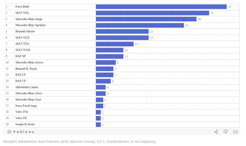 Серед окремих моделей вантажівок з повною масою понад 3,5 т найбільше український автопарк поповнився Iveco Daily (52 шт.), на другій позиції — MAN TGL (45 шт.), після якого на третій сходинці — Mercedes-Benz Atego (40 шт.).