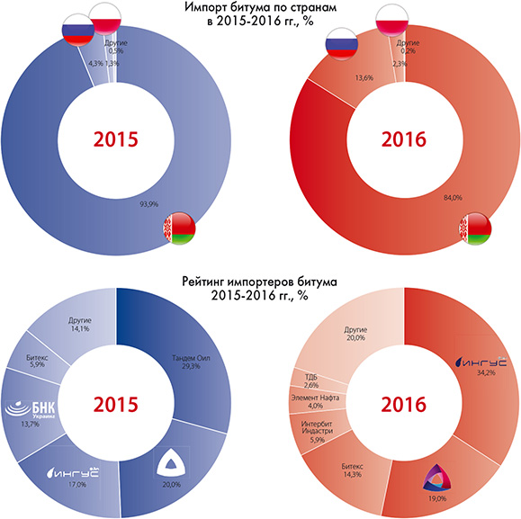 Так, структура рынка битума в Украине в течение 10 месяцев 2016 года выглядела следующим образом: 257,8 тыс. т импорта, 73,8 тыс. т производства Кременчугского НПЗ и около 9,3 тыс. т производства Кировоградской нефтяной компании и «Укргаздобычи».