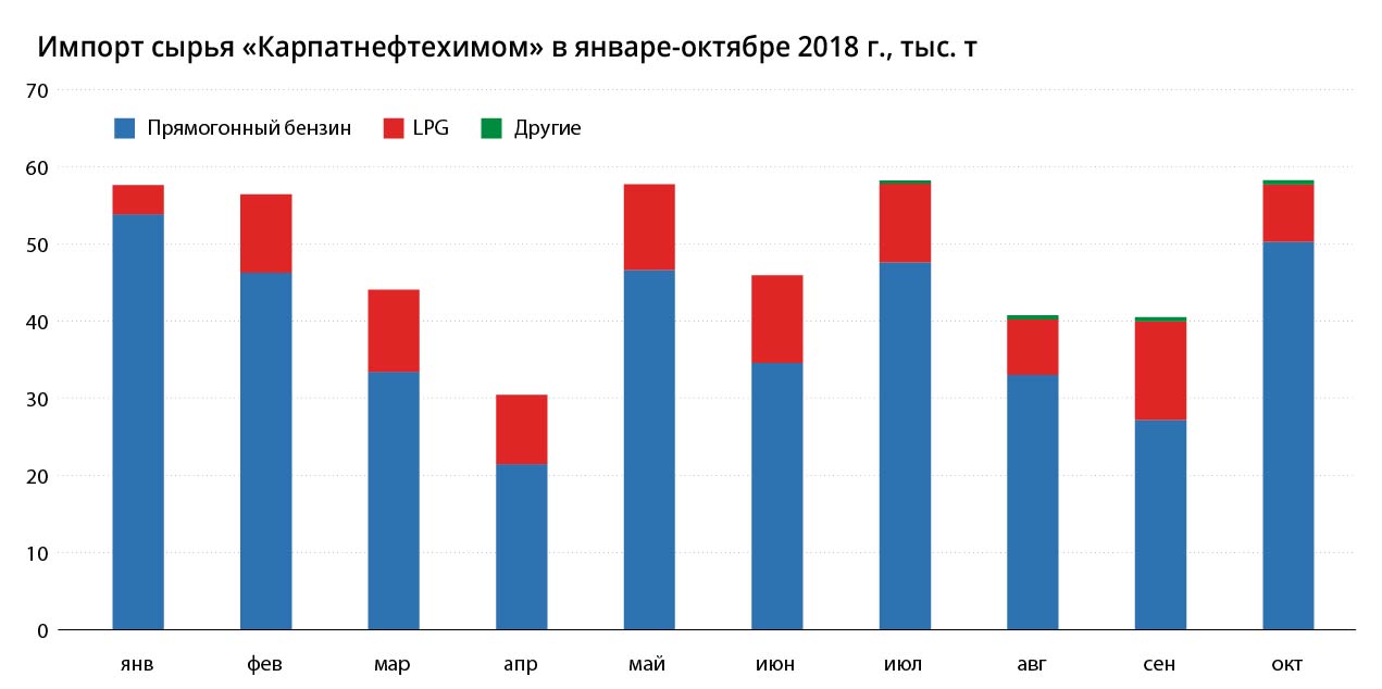 Кроме того, с 2018 года «Карпатнефтехим» стал увеличивать закупку сжиженного газа, а именно бутановой фракции, которая также используется для производства нефтехимической продукции. За 10 месяцев по железной дороге в адрес «Карпатнефтехима» было отгружено около 94 тыс. т LPG. Так, львиная доля объемов – 87 тыс. т – шла реэкспортом через территорию Беларуси из РФ (ресурс «Нижнекамскнефтехима», «Омского каучука», «Татнефти» и др. предприятий).