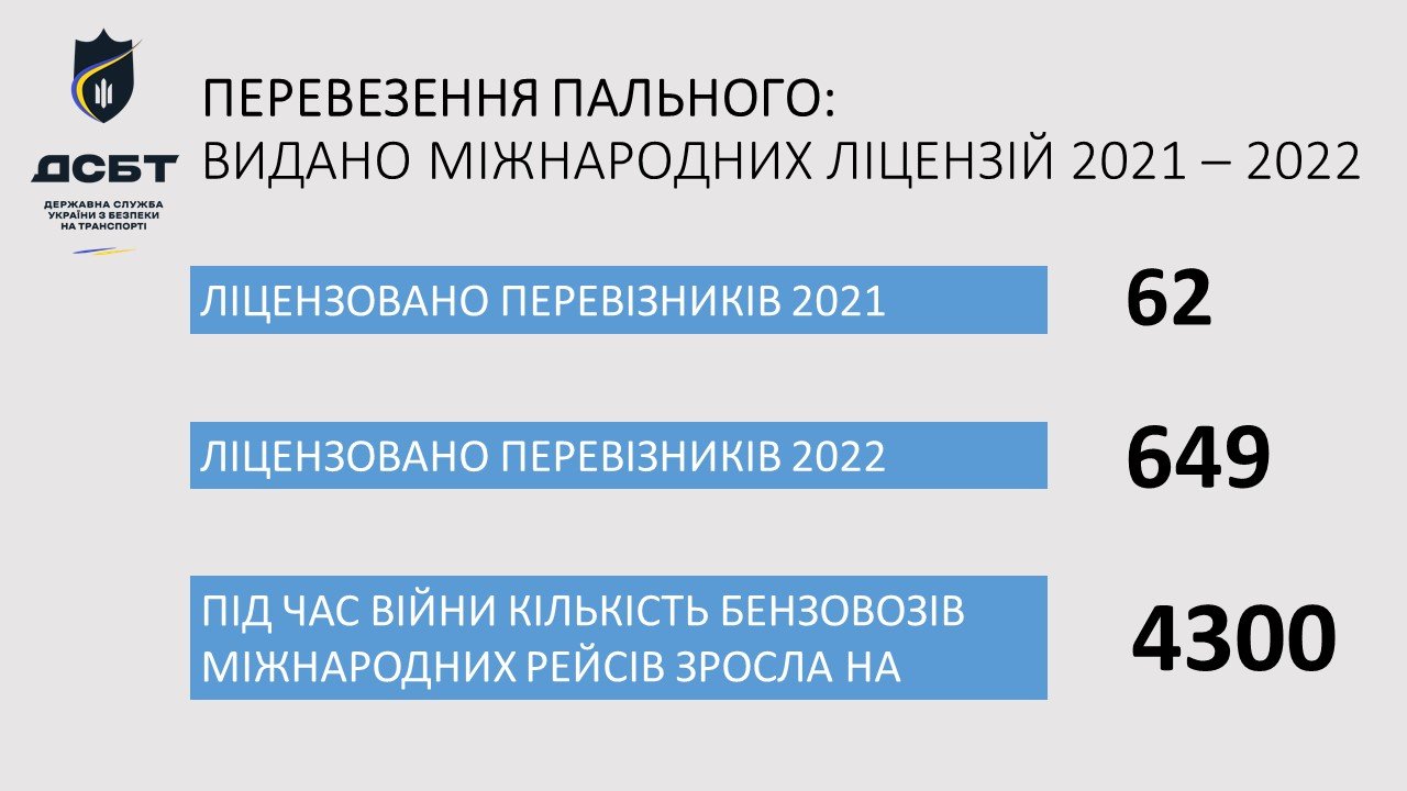 Наразі тепер автопарк ліцензійних перевізників пального складає 4300 транспортних засобів для перевезення пального.