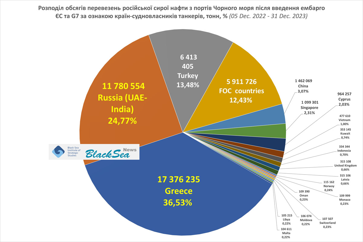 Згідно з даними BlackSeaNews, за весь період дії ембарго – з 5 грудня 2022 року – перше місце за обсягами перевезень російської сирої нафти з портів у Чорному морі зайняли судновласники з Греції. Вони транспортували 36,53% від загального обсягу перевезень, або 17,4 млн тонн. Майже 25% нафти було перевезено компаніями, пов'язаними з Росією, в тому числі зареєстрованими в ОАЕ та Індії. Ще 14% транспортували турецькі судновласники.