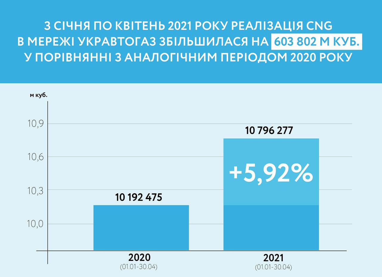 В период с января по апрель месяц 2021 реализация сжатого природного газа в сети «Укравтогаз» выросла на 603 802 м куб. по сравнению с аналогичным периодом 2020 года. Об этом сообщили в компании.