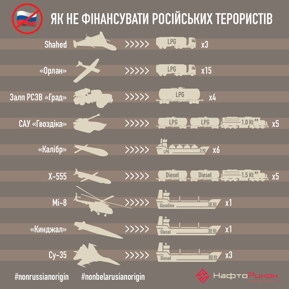 Для закупки одного БпЛА Shahed країні терористу достатньо реалізувати три газовози. Детальні підрахунки як корелюються обсяги реалізованого пального з виготовленням озброєння – надані в інфографіці НафтоРинку.
