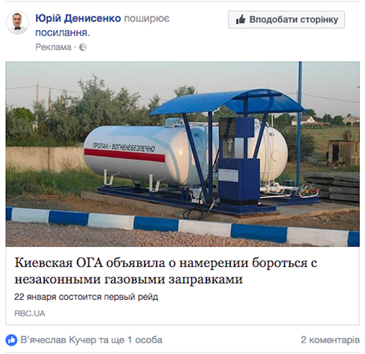 23 января со страницы в социальной сети заместителя главы Киевобладминистрации Юрия Денисенко была запущена рекламная кампания, промотирующая борьбу чиновников столичного региона с газовыми заправками.