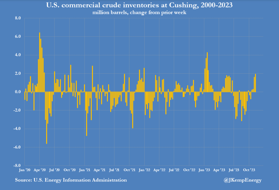 З середини жовтня запаси в Кушингу зростали протягом чотирьох тижнів поспіль, збільшившись на 4 млн барелів. Це контрастує з майже безперервним скороченням, яке тривало з кінця червня. Протягом цього періоду запаси сумарно впали на 22 млн барелів.