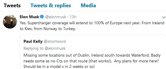 «Большинство людей не знают, что сеть Tesla Supercharger позволяет легко путешествовать на большие расстояния по США, большей части Европы, Канаде и Китаю (…) Да. Охват Supercharger будет распространяться на 100% Европы в следующем году. От Ирландии до Киева, от Норвегии до Турции», - написал И.Маск в своем аккаунте в Твиттер.