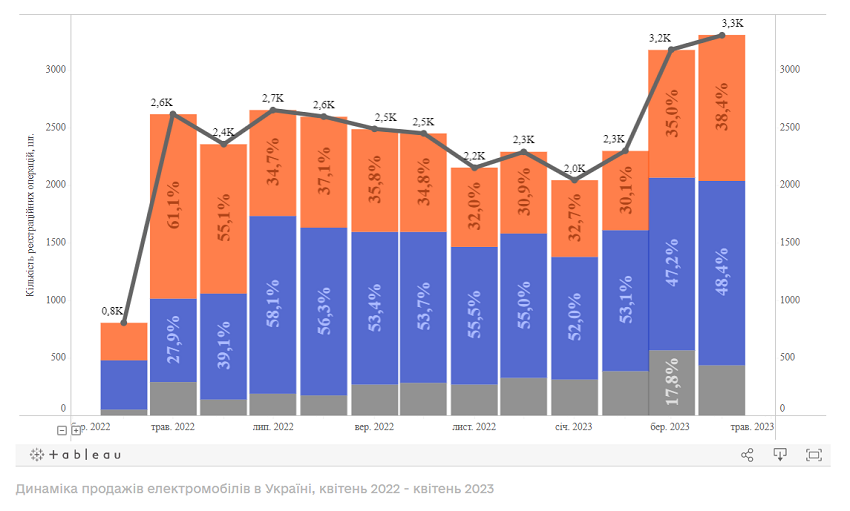 У квітні українці придбали 3,3 тисячі нових та вживаних електромобілів. Це на 300% більше, ніж у квітні минулого року та на 3% більше, ніж у березні-2023. Така кількість продажів виявилася новим рекордом продажів електромобілів в Україні, повідомляє Інститут досліджень авторинку.