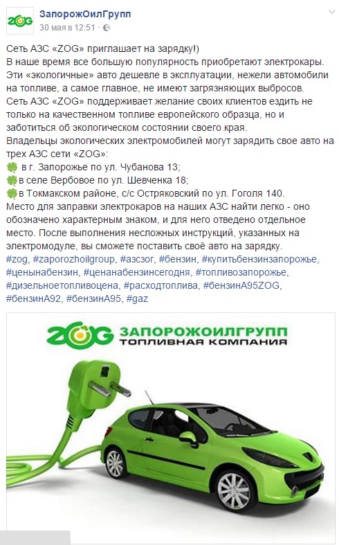 Региональный оператор ZOG – ООО «ЗапорожОилГрупп», присоединился к тренду установки зарядных станций для электро-автомобилей. На трех станциях сети для владельцев электрокаров есть возможность подзарядить свое авто.