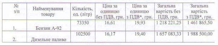 Согласно сообщению, сумма сделки с учетом НДС составила около 3,45 млн грн. Отметим, что цена за единицу товара (грн/л) составила порядка 19,93 грн/л на бензин и 19,40 грн/л – дизтопливо.