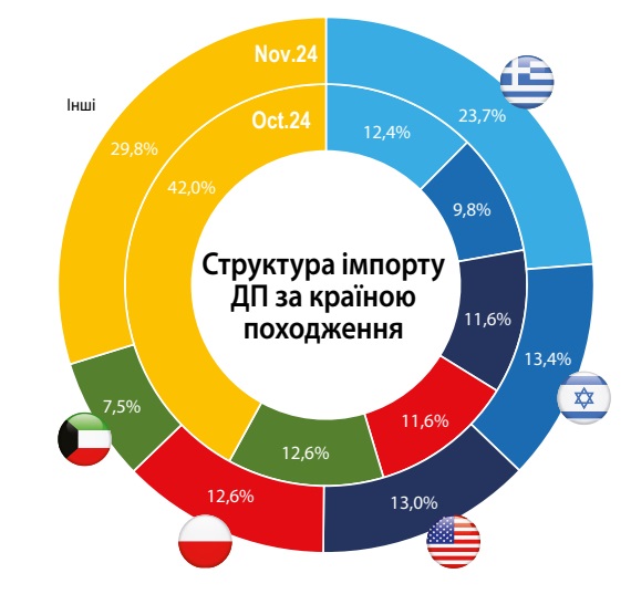 Греція повернула лідерство у структурі імпорту за країною-виробником у листопаді, збільшивши обсяги експорту до Україні вдвічі порівняно з жовтнем. На постачання з Греції припадає 23,7% загальних надходжень ДП у листопаді проти 12,4% місяцем раніше.