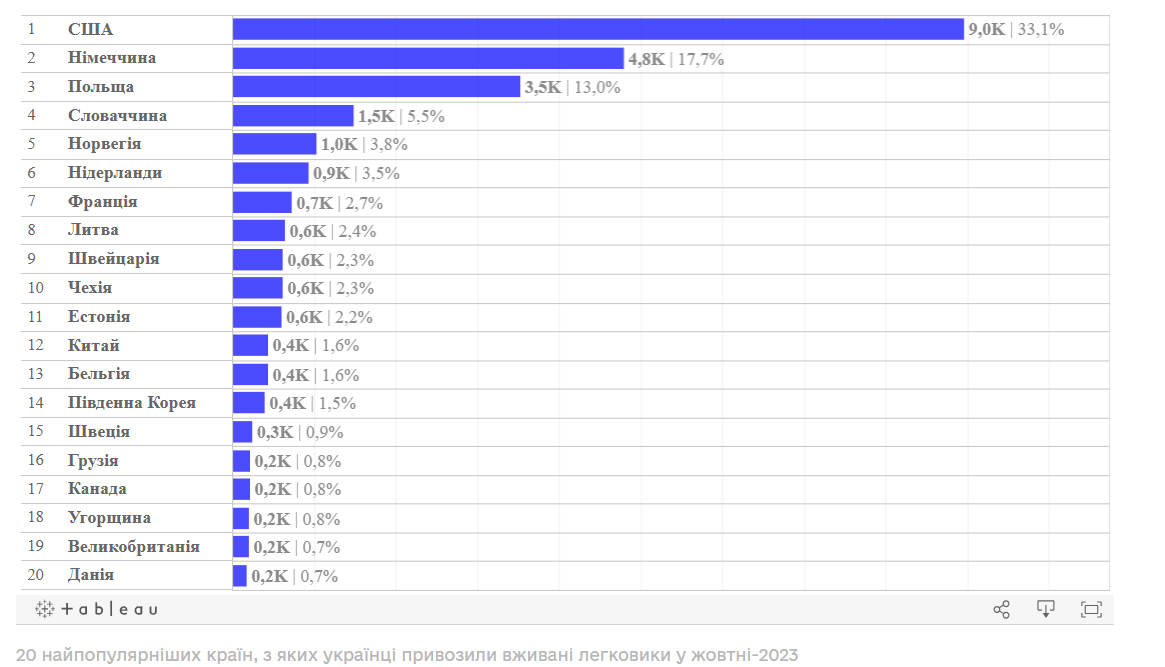 Якщо ж аналізувати тенденції купівлі вживаних авто з-за кордону в розрізі окремих країн, то на першому місці за статистичними митними підсумками жовтня Сполучені Штати Америки з солідною часткою 33,1% та 9 тисячами легковиків. Не втрачають своєї привабливості автомобілі з Німеччини — звідти прибуло 4,8 тис. вживаних легковиків, що дозволило країні з найбільшим авторинком у Європі посісти друге місце у цьому рейтингу з часткою 17,7%. Машин з Польщі прибуло 3,5 тис., а їхня частка сягнула 13%.