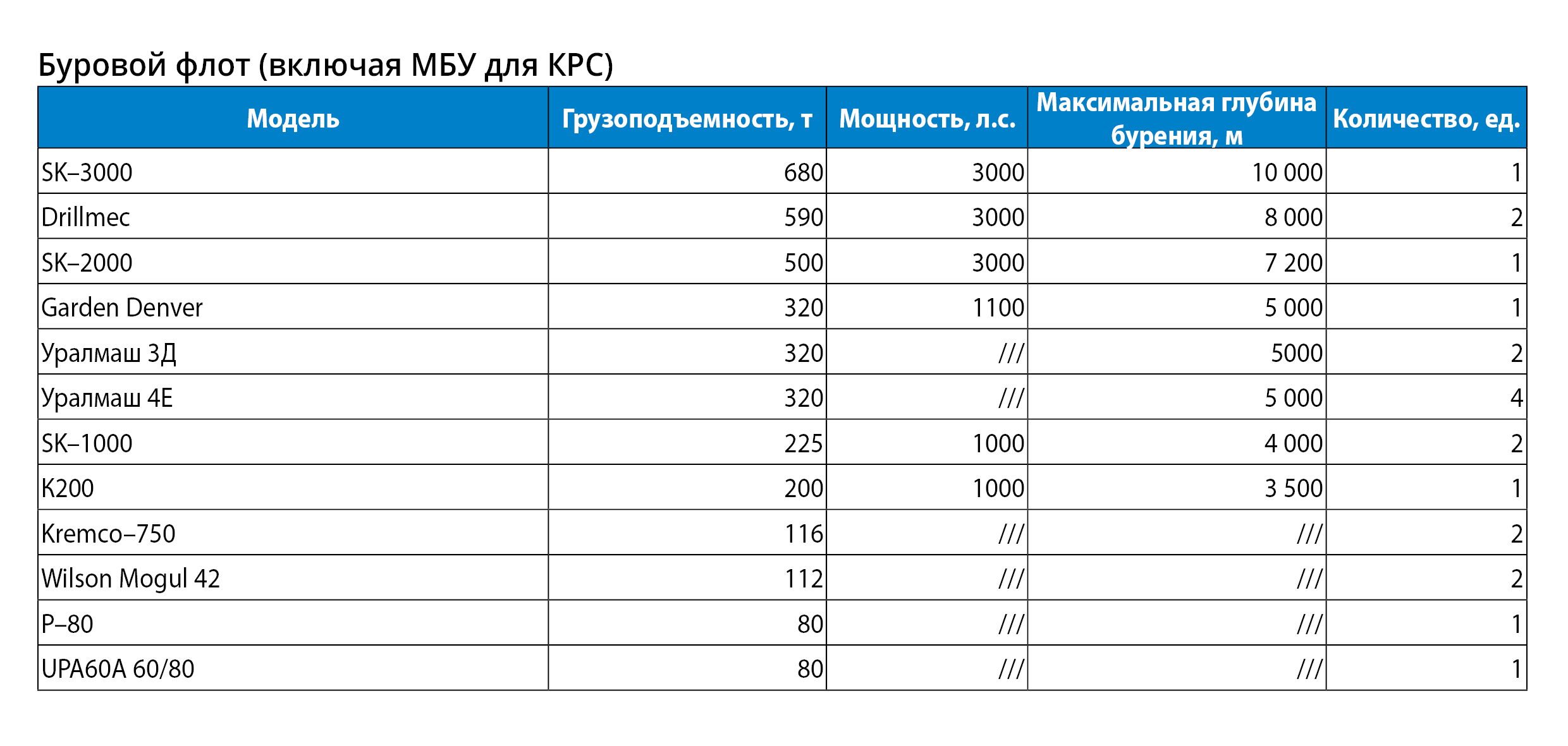 По материально-технической вооруженности компания также в лидерах. Подразделения компании владеют 20 буровыми станками грузоподъемностью от 112 до 680 т, в частности самым большим в Восточной и Центральной Европе сухопутным станком SK 3000 (стоимость 1 млрд грн, в том числе 200 млн налоги - НР), который в данный момент работает на Водяновском месторождении в Харьковской области. Кроме того, компания оперирует крупнейшим в стране флотом ГРП, состоящим из 15 насосов общей мощностью 35 тыс. к.с, имеет собственный колтюбинговый флот NOV Hydra Rig, три азотные установки, а также широкий парк собственной спецтехники (150 ед.).