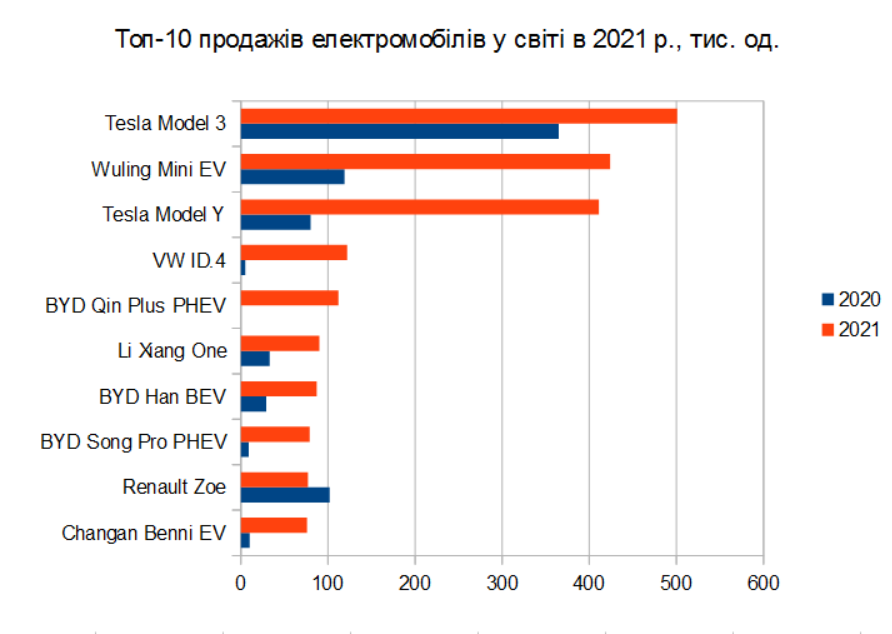 В десятку також потрапила модель Renault Zoe, яка, втім, втрачає свою популярність: кількість реєстрації цієї моделі знизилася з 102 тис. од. в 2020 р. до 77 тис. од. в 2021-му. Zoe належить до категорії компактних авто, які популярні переважно в Європі. Проте ця модель на тлі появи нових електрокарів такого ж цінового сегменту вже здається застарілою. Зважаючи на це, попит на неї, скоріше за все, продовжить знижуватися.