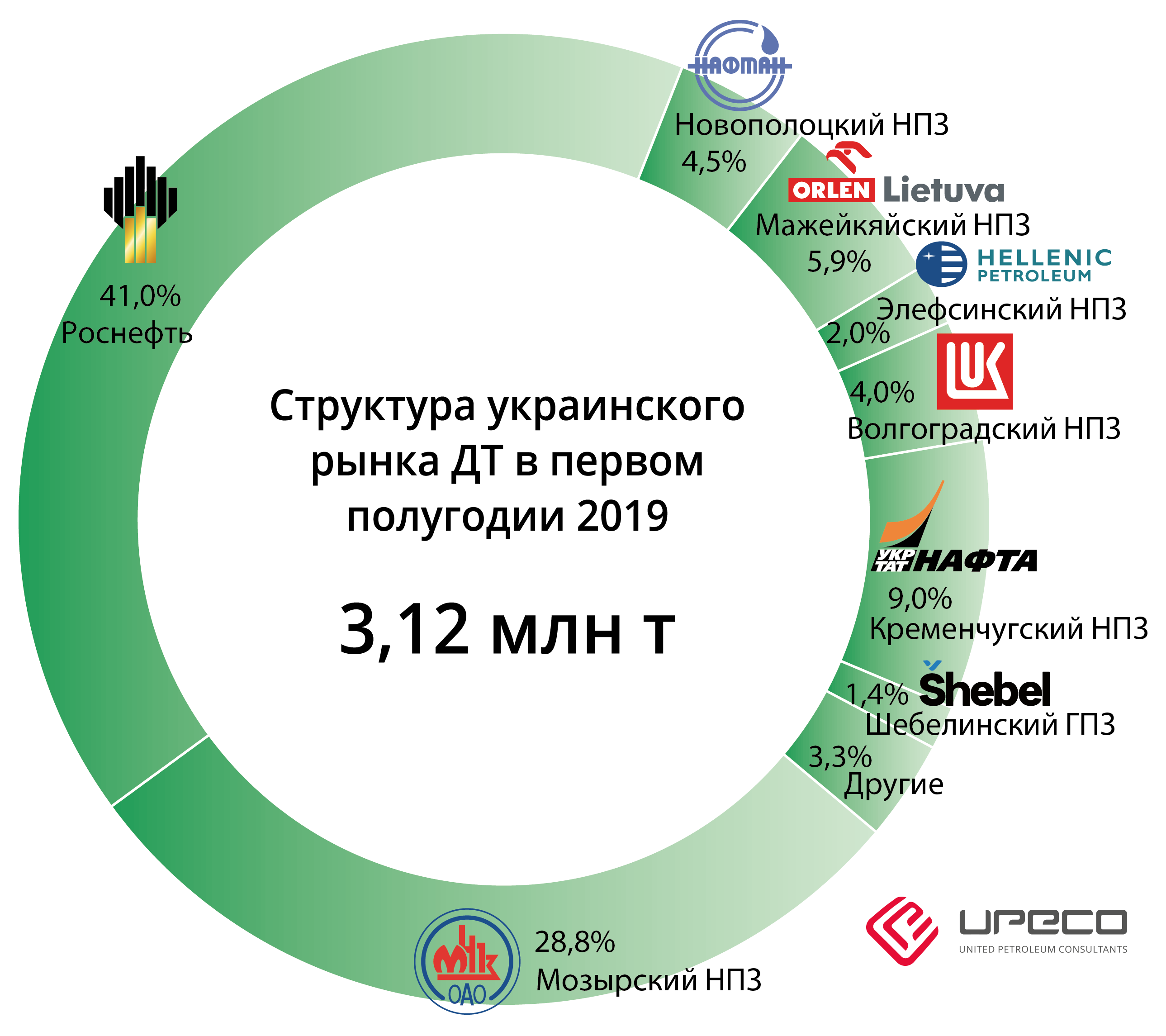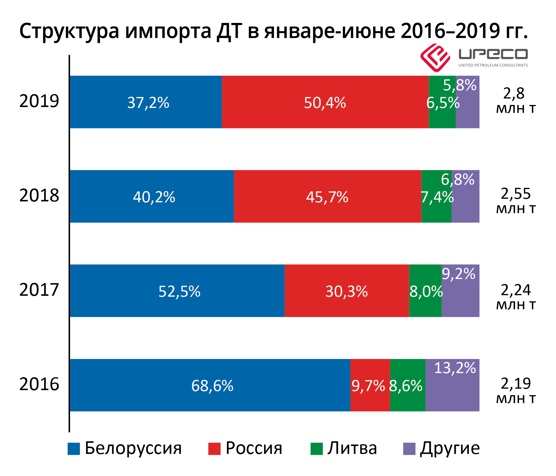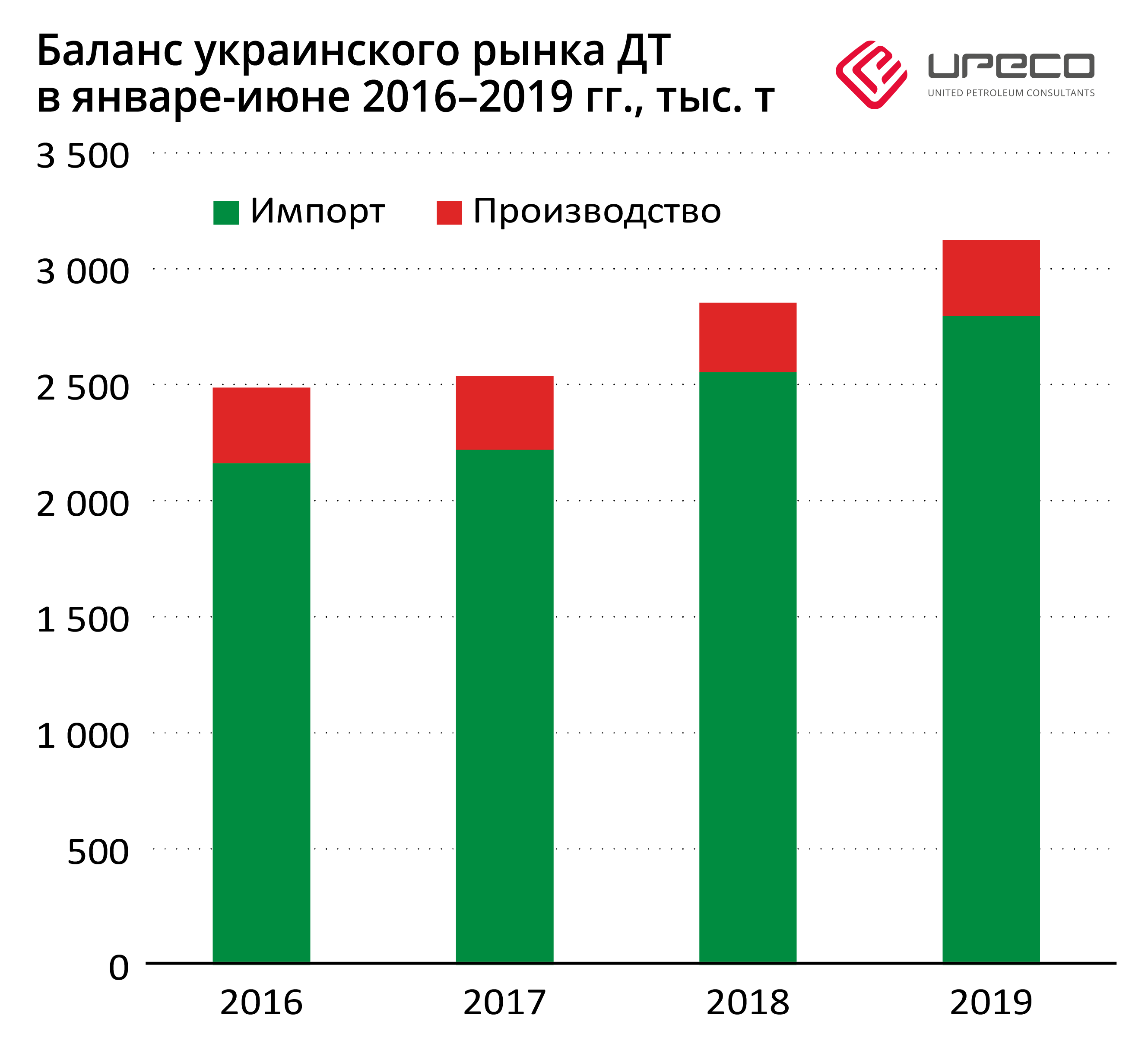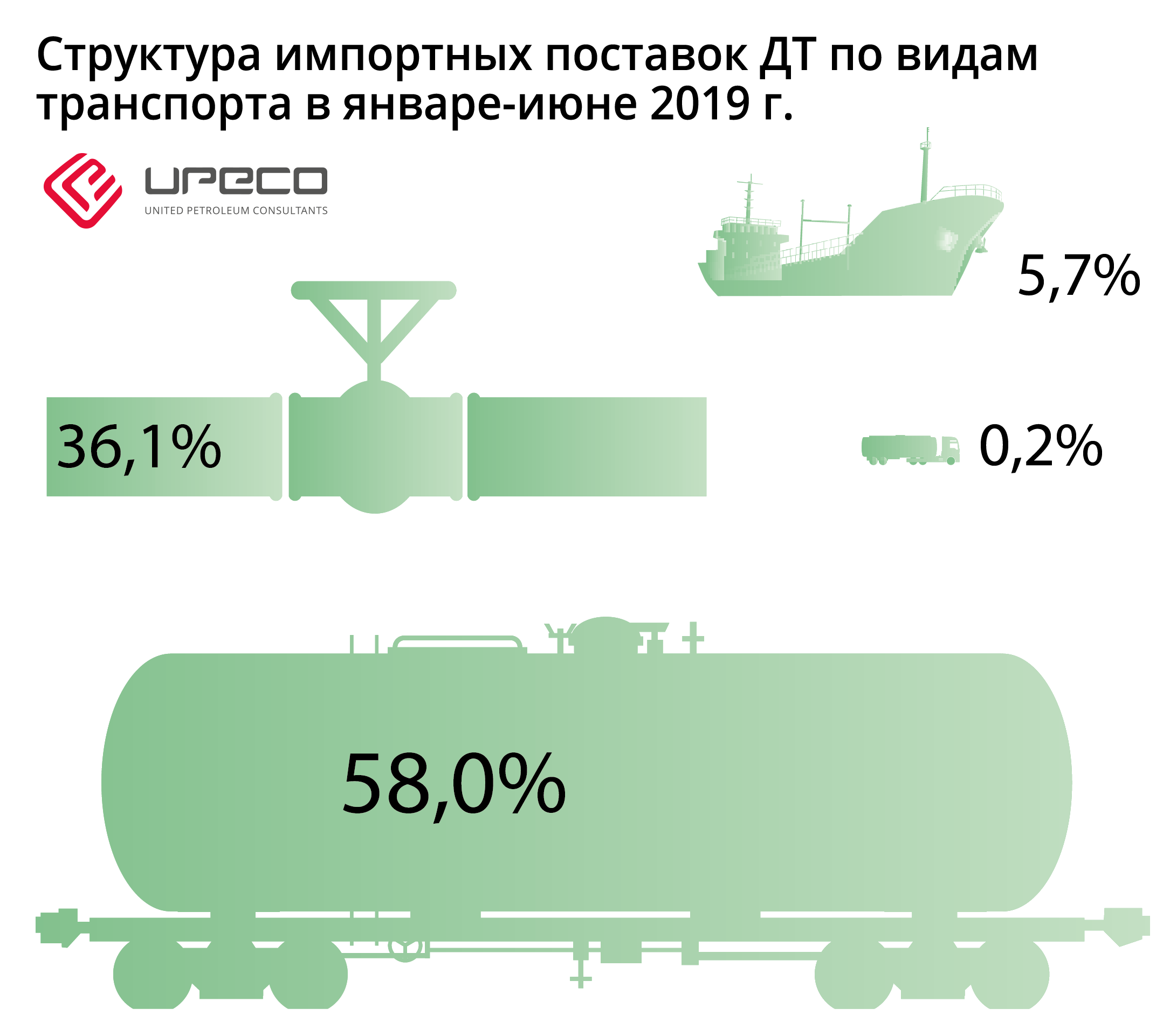 ДТ в Украину в первом полугодии 2019 г. в основном везли сухопутным транспортом: по ж/д, трубопроводу, а также с учетом около 4,3 тыс. т венгерского ДТ производства Mol в автоцистернах на западной границе – составили 2,63 млн т или 94,2% импорта.