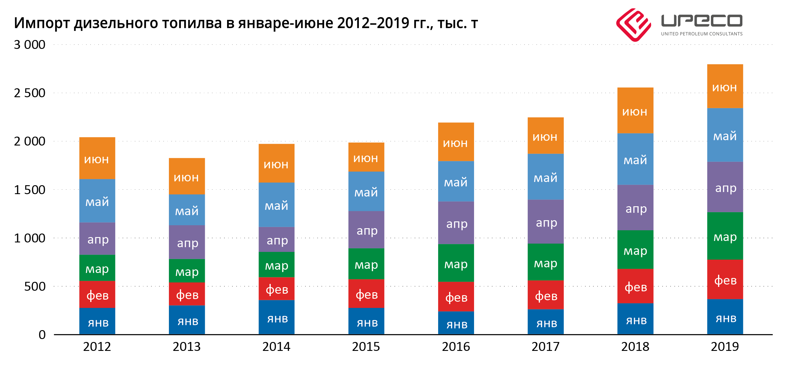 Однако основную часть рынка дизтоплива составил импорт, который в январе-июне 2019 года вырос на 242,7 тыс. т до 2,78 млн т. Такой результат является самым высоким как минимум за последние 8 лет.