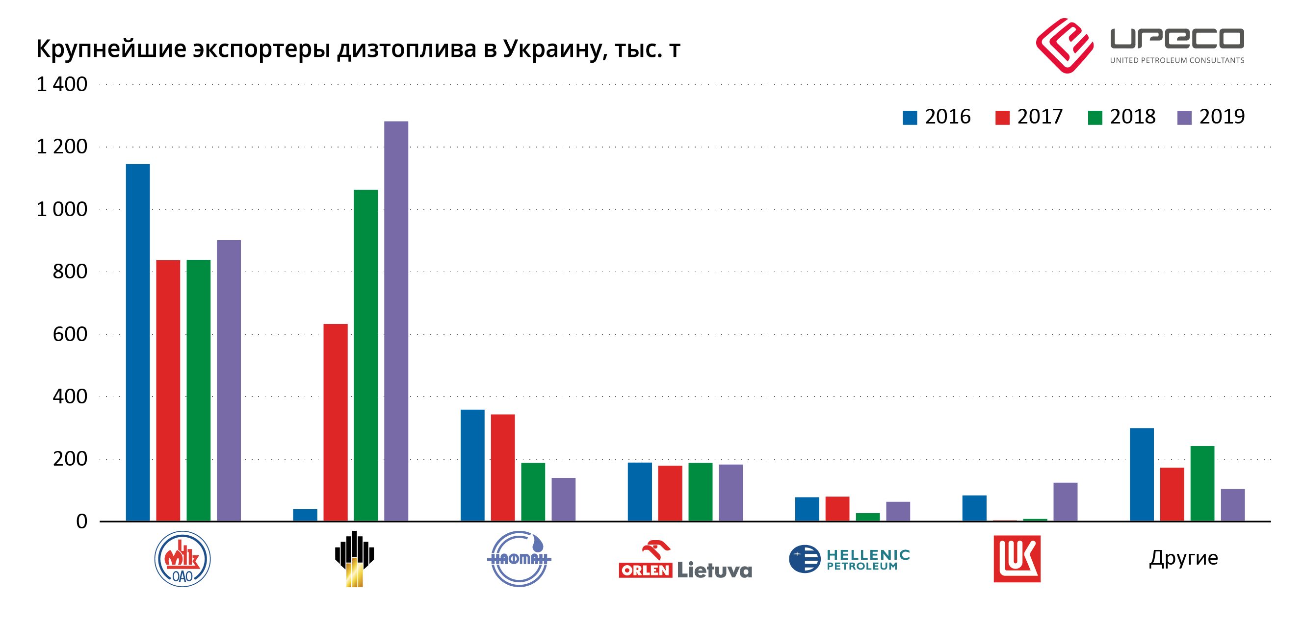 Нарастив поставки, отметку в 100 тыс. т преодолели: группа компаний UNIMEX – 119,9 тыс. т, оптовый трейдер «Альянс Энерго Трейд» – 116,2 тыс. т. Обе компании тесно работали с трубой, помогая развивать кураторам поставок из РФ бизнес в Украине. В частности, один из основателей UNIMEX Борис Ганджа в начале 2019 года стал руководителем подконтрольной Wexler компании «Глуско». Поставки UNIMEX/«Элемента» приросли за счет увеличения импорта трубного ресурса на 21 тыс. т до 78,8 тыс. т (65,7% поставок группы). На долю белорусского ресурса приходится 27,4% импорта, а его объемы практически не изменились в 2019 – 32,9 тыс. т. Остальное дизтопливо – индийского и туркменского производства с южных перевалок.