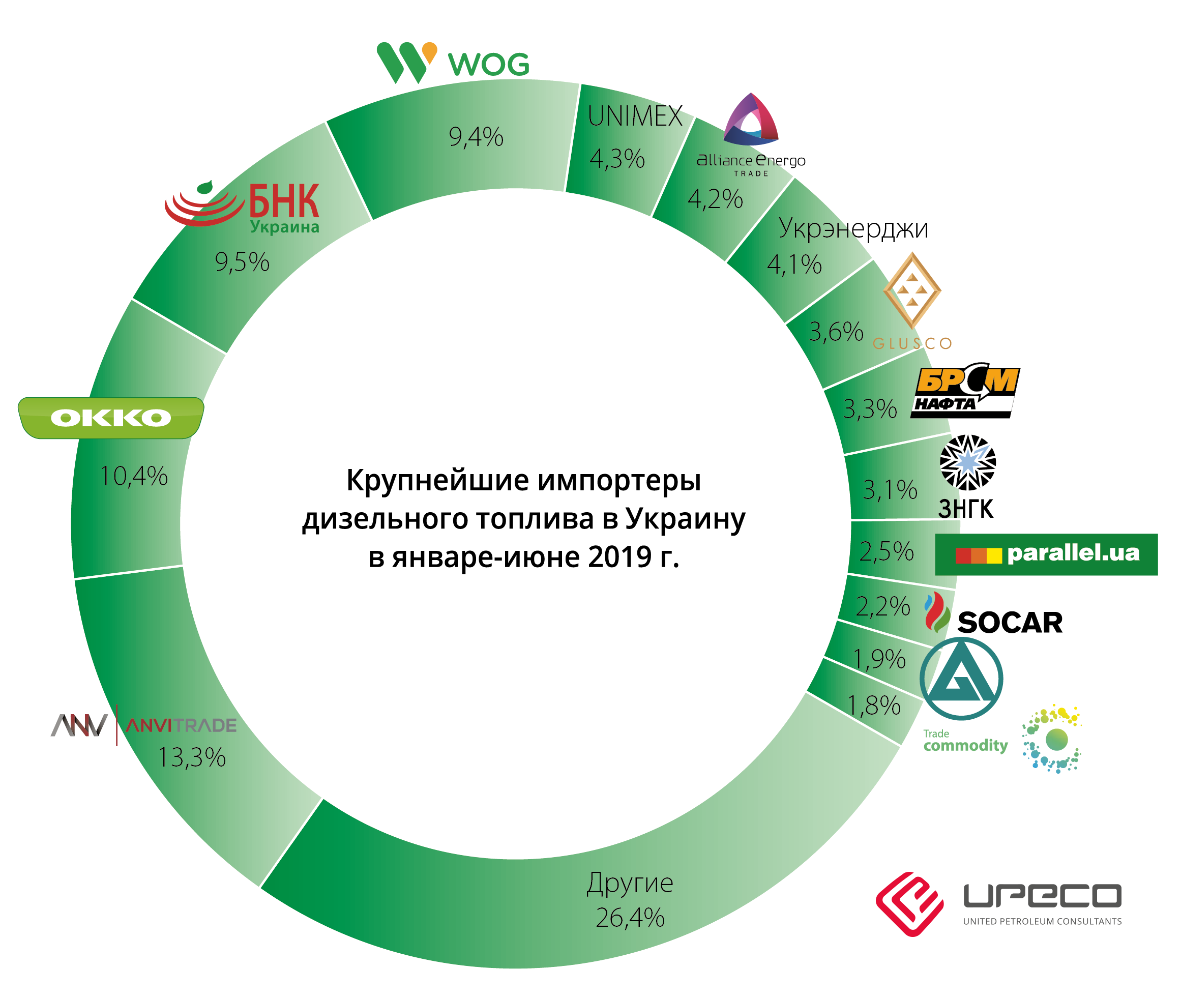 В рейтинге импортеров большого чуда не произошло. На фоне роста объемов трубного ДТ крупнейшим импортером дизтоплива выступил постреволюционный проект «Анвитрейд» (Wexler Group). В течение полугодия их группой украинских контрагентов было оформлено 369,1 тыс. т дизтоплива производства «Роснефти» и 8,6 тыс. т с Мозырского НПЗ (его поставки и продажу компания начала в марте 2019 года) – это те объемы, которые продавались в Украине за гривну.