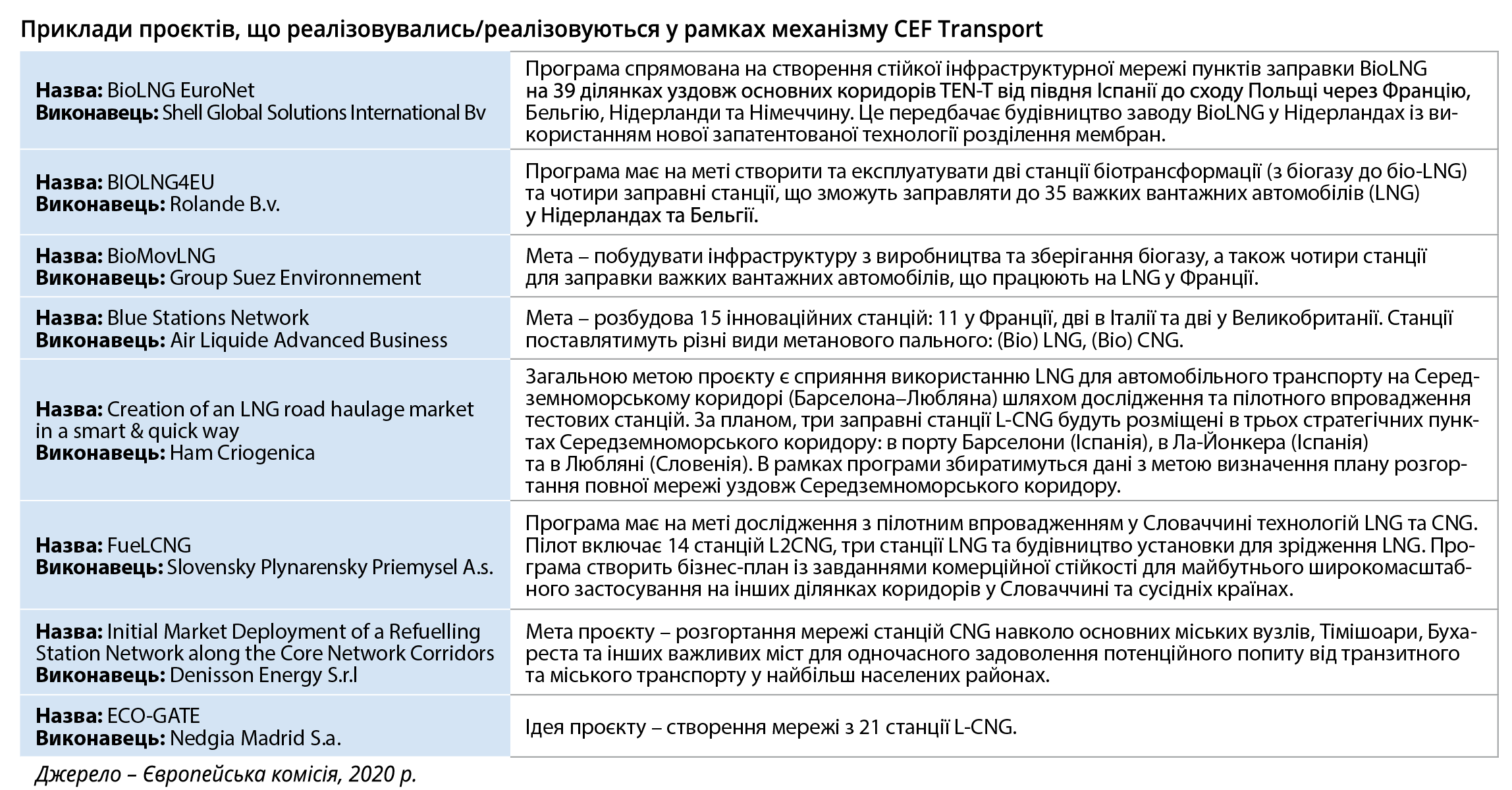 У рамках механізму CEF Transport профінансовані десятки проєктів із просування газомоторного пального. Виконавча агенція з питань інновацій та мереж (INEA) є головним розпорядником коштів. У період 2004-2020 рр. були реалізовані переважно «пілотні» проєкти з будівництва мереж АГНКС, що включали дослідження, будівництво, моніторинг бізнес-процесів тощо.