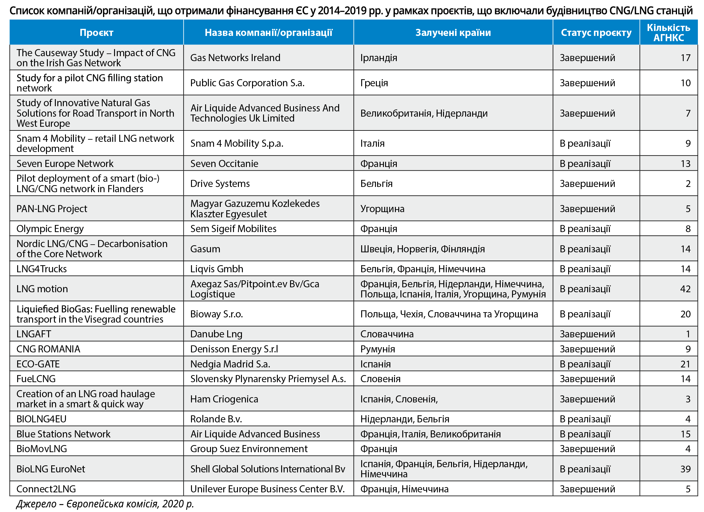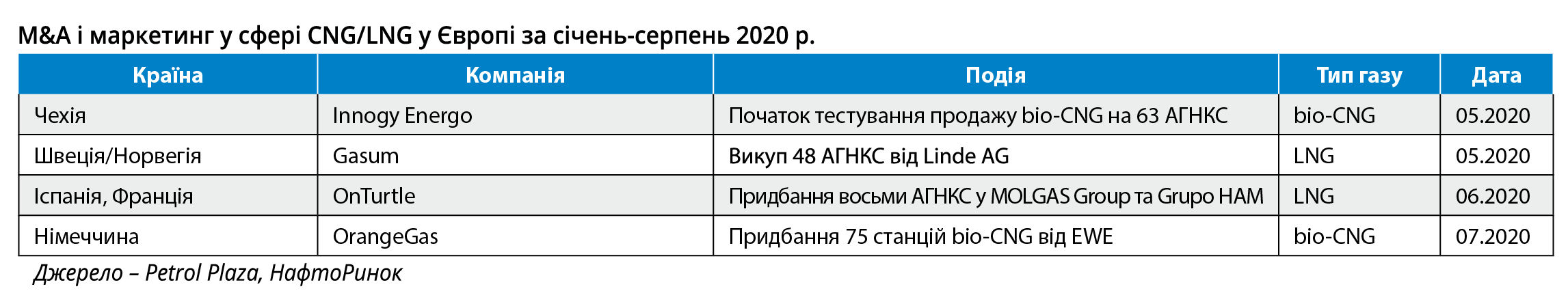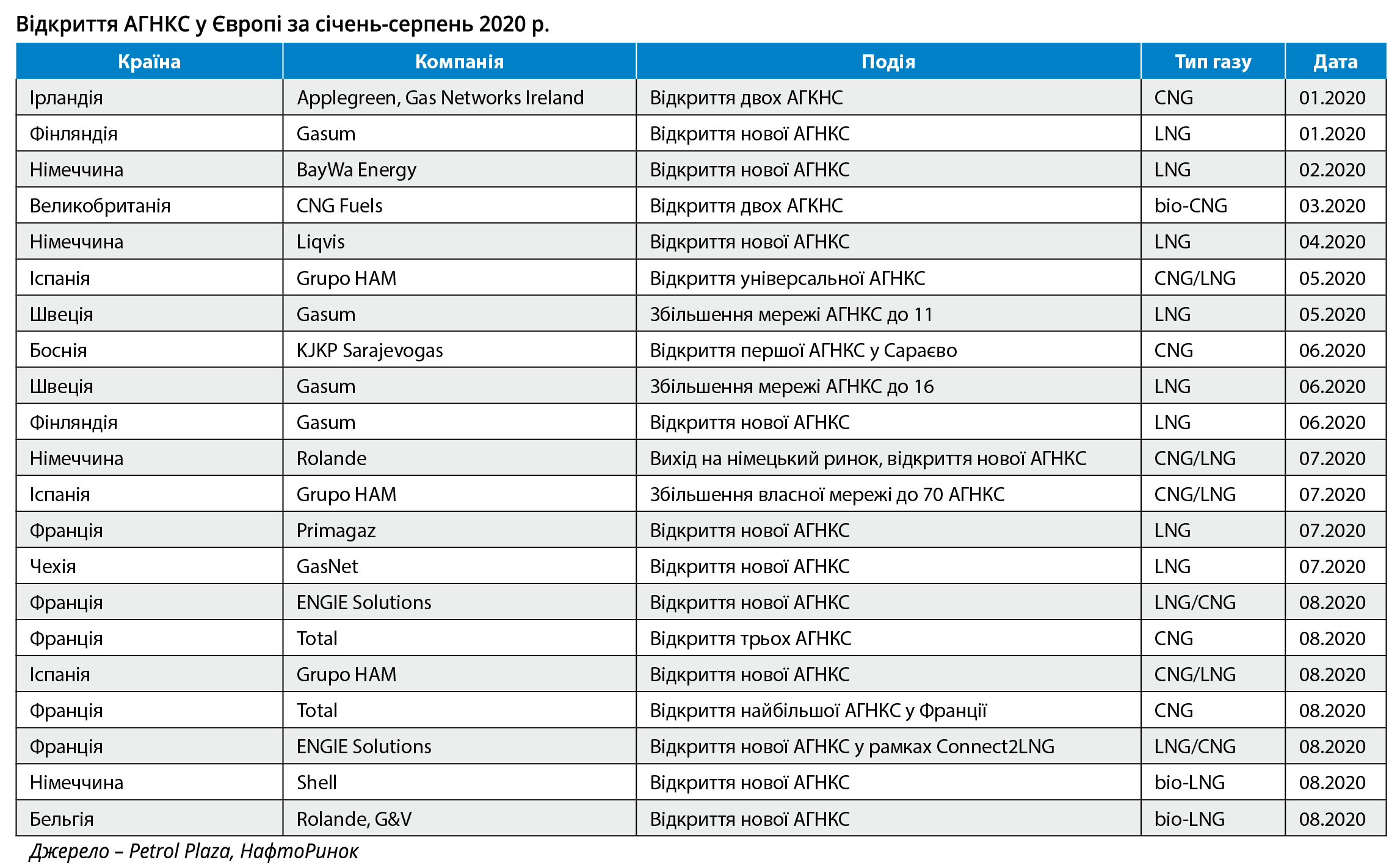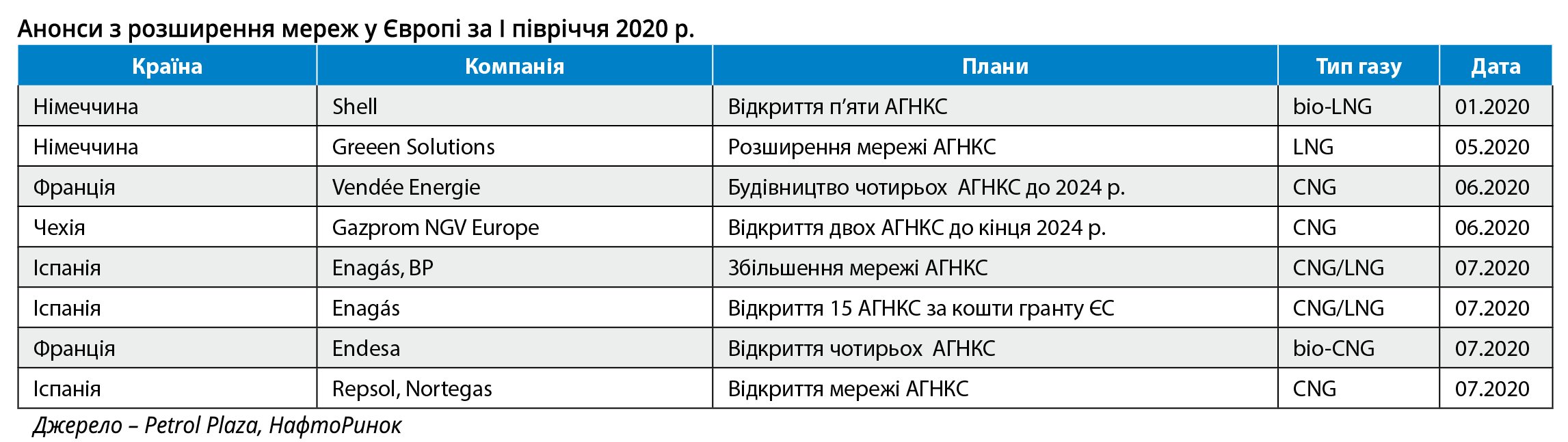 У Європі працює більш ніж 4100 АГНКС. Їхня кількість активно зростає. Крім суто комерційного інтересу, важливу роль відіграє політика, а саме: глобальні плани з декарбонізації світової економіки та переходу на «чисті» енергоресурси, а також посилення інтеграції у ЄС. У першій половині 2020 р. значно пожвавилася діяльність європейських операторів у напрямку будівництва нових станцій. На перший погляд здавалося, що оператори в умовах низьких цін на природний газ зорієнтувались і почали активно нарощувати кількість власних мереж. Проте при більш детальному вивченні ситуації виявилося, що у відповідний період вони завершували профінансовані ЄС проєкти, що стартували ще у 2016 р. Однак динаміки додавали й оператори, що фінансують розвиток мереж за власний кошт.