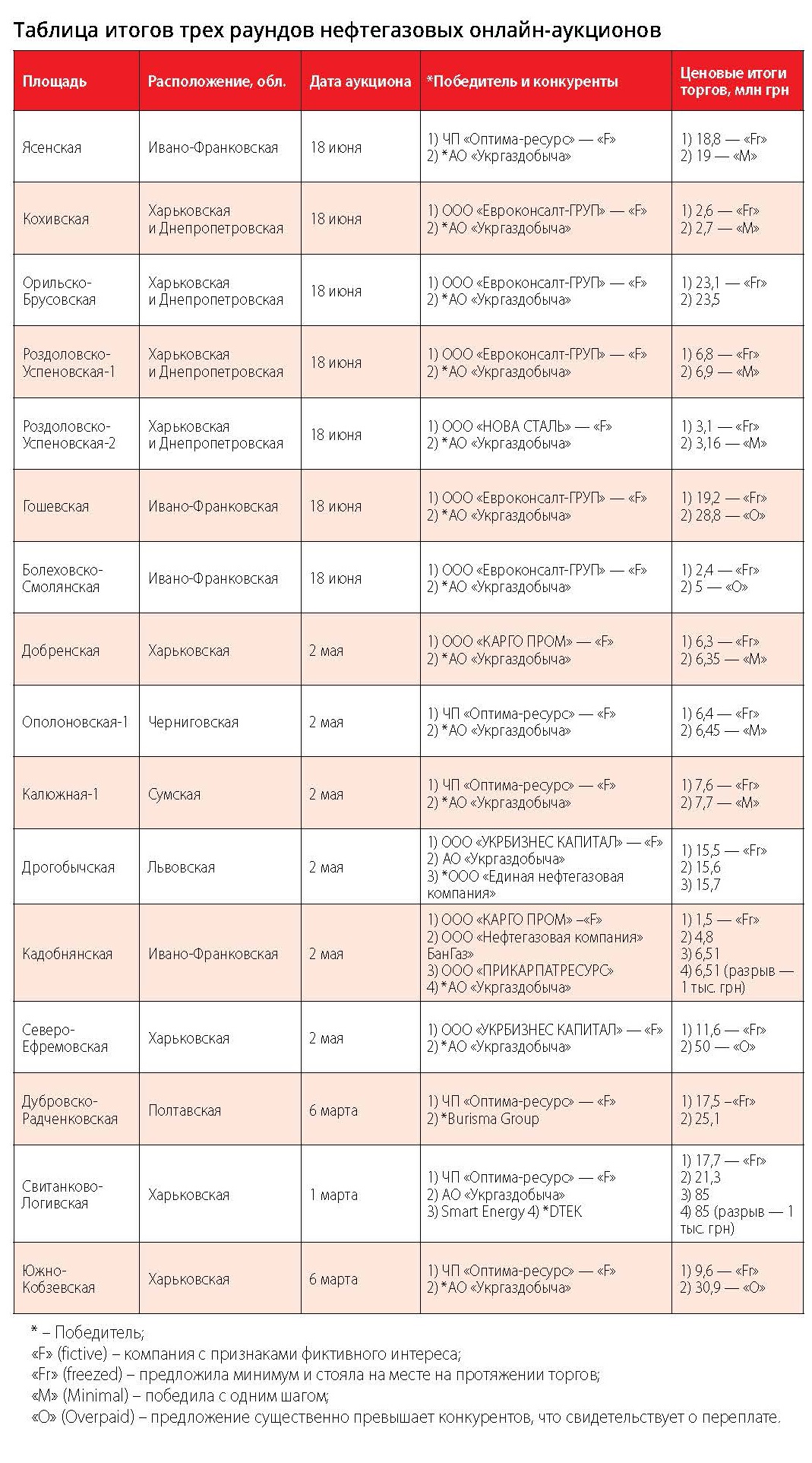 Но обошлось, ведь конкурентами «Укргаздобычи» стали киевская ООО «ЄВРОКОНСАЛТ-ГРУП», что занимается торговлей как топлива, обуви, товарами широкого ассортимента, так и подрабатывает исследованиями общественного мнения (как минимум указывает это как вид деятельности). Кроме того, на ратный бой за недра вышли днепропетровская ООО «НОВА СТАЛЬ», что занимается оптовой торговлей металлами, и полтавская ЧП «Оптима-ресурс», которая занимается производством мебели. АО «Укргаздобыча» не растерялась и деньгами перебивала все ставки, хотя, надо признать, конкуренты были сдержаны, и «шаг» аукциона во всех трех раундах по всем месторождениям составлял в среднем ноль гривен.