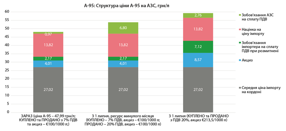 Уважно подивіться на діаграму, де розкладена на складові поточна ціна бензину А-95 з податками. На перших двох стовпчиках видно, чому зараз трейдери як вогню бояться повернення ставки в 20%. Бо прийдеться сплатити різницю ПДВ: пальне куплене при ставці 7%, а продано при 20% (ну або більше попрацювати над його оптимізацією). Це, так би мовити, «повернення кредиту», який держава дала ще у березні 2022 р., коли знизила ПДВ на 13%.