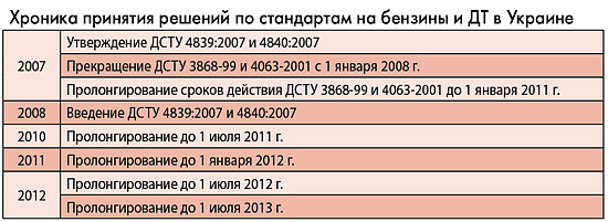 С 1 июля 2013 года прекращают действие два ДСТУ на бензины и ДТ 2001 года. Согласно приказу Министерства экономического развития и торговли Украины №843 от 20.07.2012 года «Про внесение изменений в приказ Госкомитета Украины по вопросам технического регулирования и потребительской политики от 12.12.2007 №357», стандарты, приближенные к Евро-2, продлевались на год. Сегодня из-за отсутствия приказа об очередном продлении под угрозой остановки оказался Шебелинский ГПЗ («Укргаздобыча»).