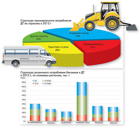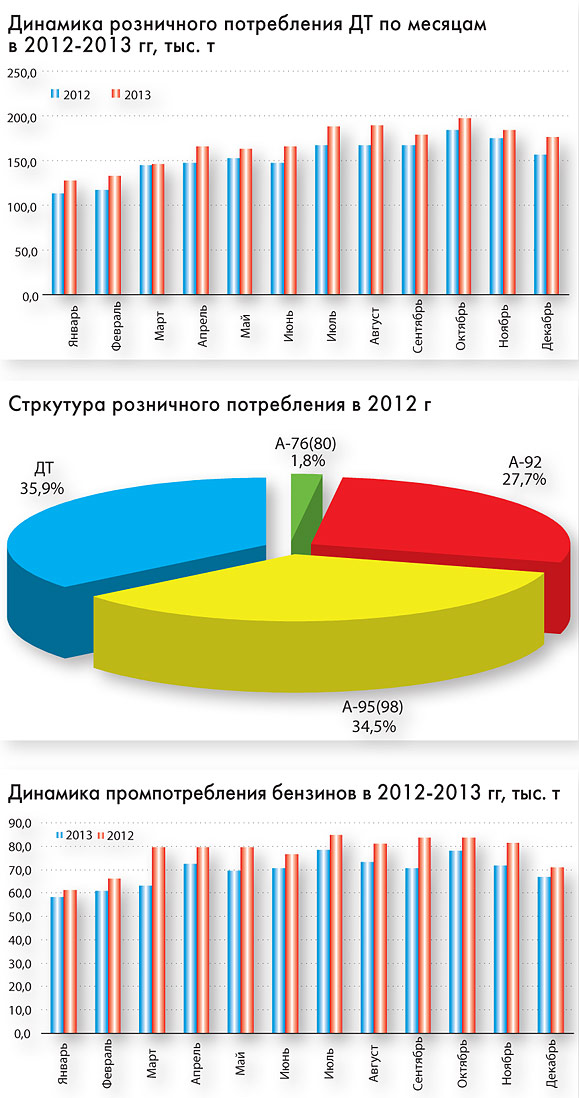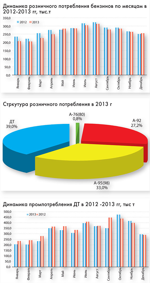 В отличие от «футбольного» 2012 года, когда активно шла подготовка к Евро-2012, требовавшая активизации в строительной сфере, перевозках и производстве, в 2013-м промпотребление топлив показало снижение. Объемы промышленного производства снизились на 4,7%. Соответственно, потребление бензинов в этом секторе по сравнению с 2012 годом сократилось на 10% (94,5 тыс. т) и составило 832,9 тыс. т, дизтоплива – на 6% (245 тыс. т), до 3,94 млн т.