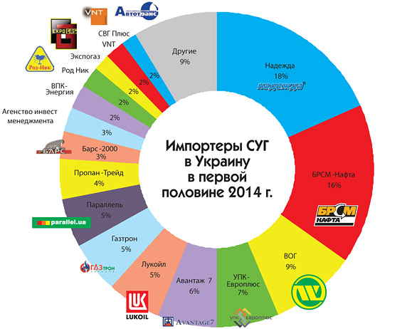 По сравнению с 2013 годом в структуре импортеров произошли некоторые изменения. Компания «Надежда» в первой половине 2014 года приросла ресурсом более чем на 32%. Полтавчане являются лидерами украинского рынка, на них приходится около 18% всего импорта. В спину «Надежде» дышит «БРСМ-Нафта». Украинский ритейлер за шесть месяцев этого года нарастил поставки на 20,6%, до более чем 35 тыс. т LPG. Значительный рывок совершил «Континиум», который увеличил собственный импорт с 3 тыс. т в первой половине 2013 года до 19,2 тыс. т в 2014 году. «Авантаж 7» также не отставал и импортировал на 7,7% больше, а именно 13,3 тыс. т. Кроме того, рост объемов показали компании «Газтрон-Украина», «Барс-2000», VNT и «СВГ Плюс».