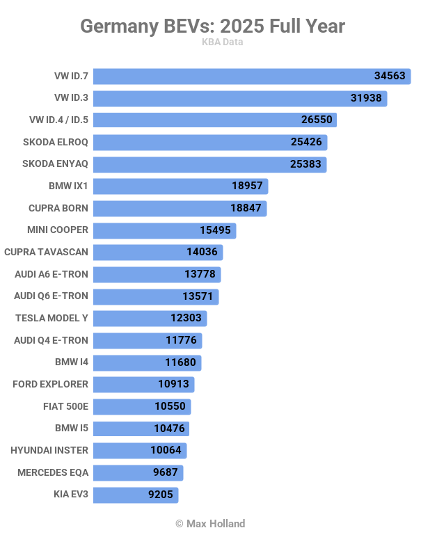 У 2025 році Volkswagen знову став найпопулярнішим брендом електромобілів у Німеччині, за яким слідує BMW, а американський виробник Tesla опустився на дев'яте місце. Найпопулярнішою моделлю електромобіля в Німеччині у 2025 році був VW ID7, на другому місці — VW ID3, а на третьому — VW ID4/ID5.