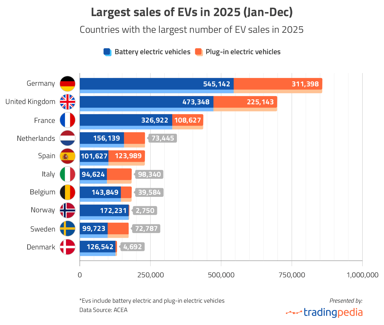 У 2025 році у Великій Британії було продано приблизно 698,5 тис. електромобілів: 473,35 тис. чистих електрокарів і 225,14 гібридних (PHEV), свідчать дані trading pedia, зібрані на основі статистики Європейської автомобільної асоціації ACEA.