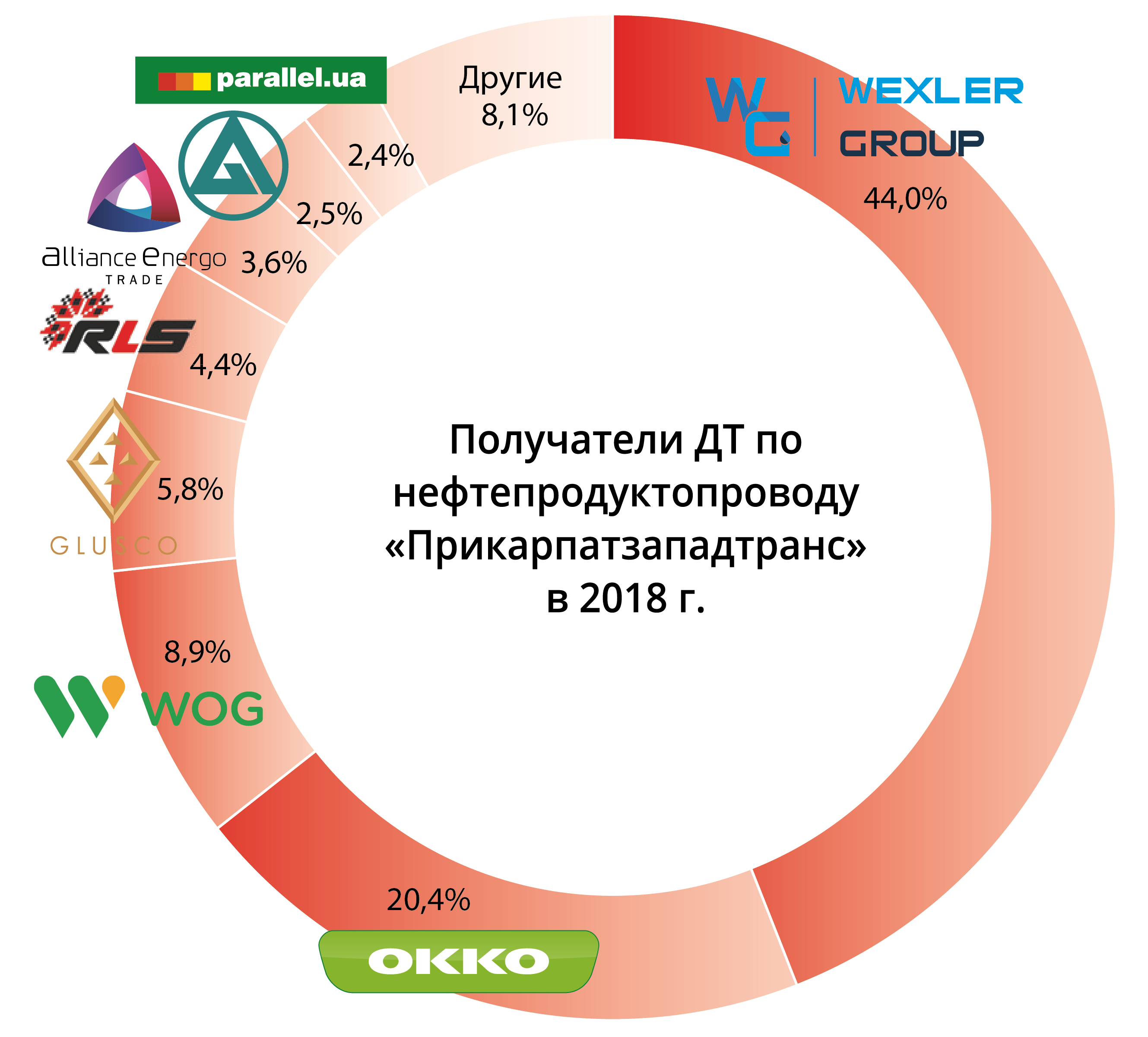 За три года прокачки российского топлива по украинскому участку трубы увеличились с 1 до 2 млн т топлива. По данным источников НефтеРынка, сейчас компания транспортирует нефтепродукты «Роснефти» по договорам с Proton Energy Group SA Нисана Моисеева от 2 февраля 2017 года и Wexler Global LP Петра Белза от 11 мая 2017 года. В 2018 году крупнейшим получателем ресурса стали Wexler Group – 886 тыс. т, ОККО – 410 тыс. т, WOG – 180 тыс. т и Glusco – 160 тыс. т.