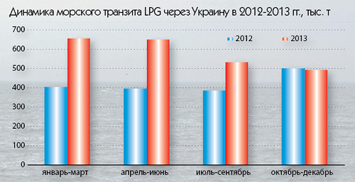 В сравнении с 2012 годом рост морского транзита составил 38%, или дополнительно 642 тыс.т. Украинские порты получали объемы преимущественно от российских производителей, которые по сравнению с показателями 2012 года нарастили общий экспорт СУГ на 13% (всего российский экспорт в прошлом году составил более 5 млн т).