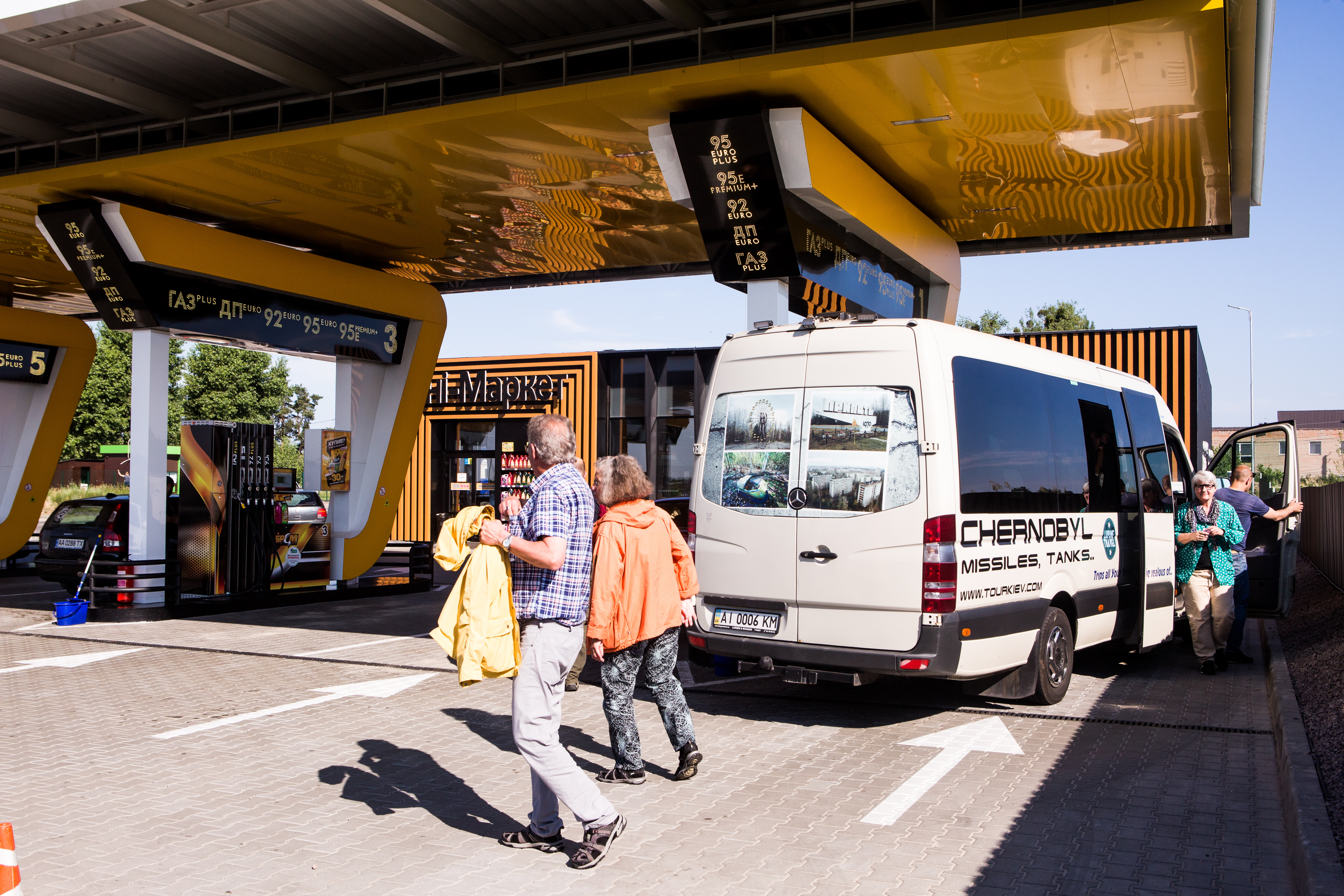 Первые автобусы, как нам и обещали, появляются в начале девятого утра. «Чернобыльские» туристы выходят из автобусов и тянутся к мини-маркету, прежде всего, для чего? Ну конечно, чтобы выпить утренний кофе! Кофейный бизнес на этом АЗК даст фору многим столичным кофейням – так аккуратно, толково и комфортно он здесь организован.