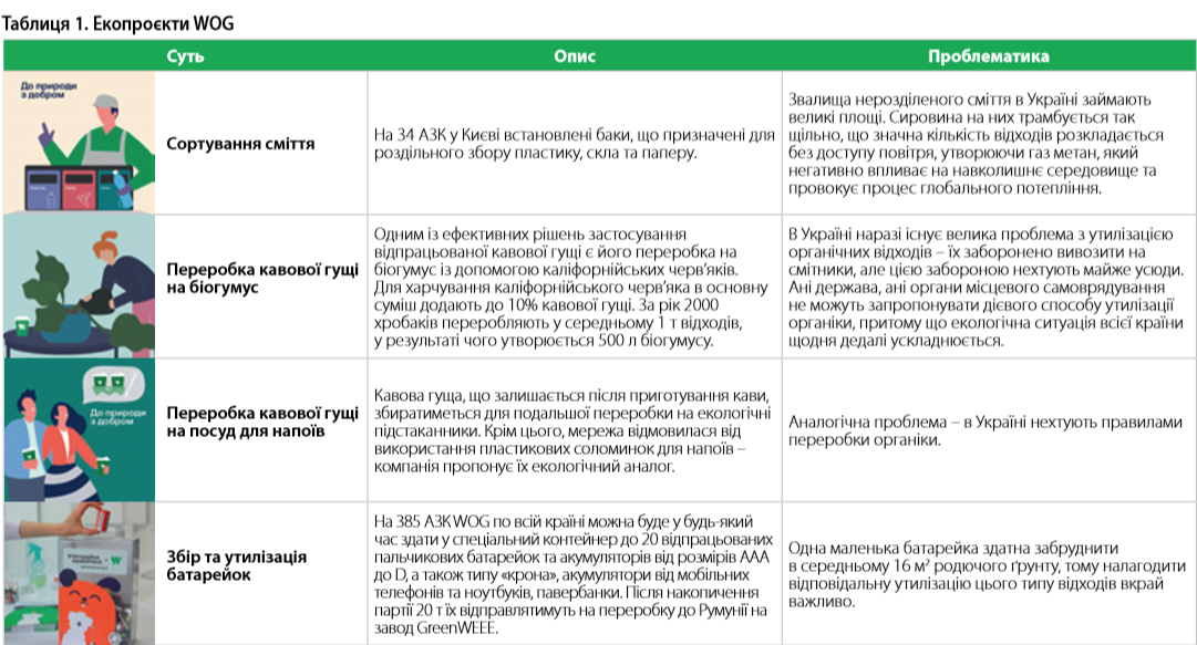 У 2020 р. мережа АЗК WOG запустила цілу низку важливих проєктів у сфері ощадливого використання різноманітних ресурсів, була створена ЕКО‑платформа «До природи з добром». Ця ініціатива наразі складається з чотирьох основних напрямів.