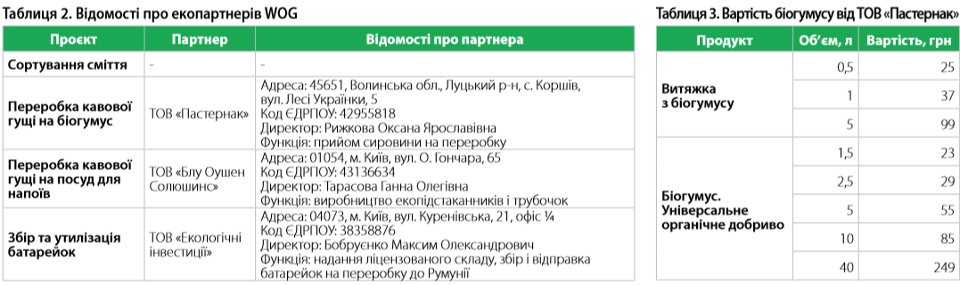 Баки, які можна побачити на заправках мережі, призначені для роздільного збору пластику, скла та паперу. Вони позначені різними кольорами та спеціальними символами згідно з міжнародною класифікацію. Важливо, що їх вивозять окремим транспортом та доставляють саме до спеціалізованих пунктів переробки. Завдяки цьому «друге життя» отримують вироби з паперу та скла (вони переробляються на аналогічну нову продукцію). З пластику (HDPE, LDPE, PP) виготовляють одноразовий посуд, харчові контейнери, пакети, пакування для продуктів, шприци, оздоблювальні матеріали та ін. Але нас у цьому контексті цікавлять саме відходи паперу. Як уже було згадано, мережа WOG транспортує кавову гущу на виробничі потужності Blue Ocean Solutions, яка в подальшому виробляє екопідстаканники, трубочки й у майбутньому – кришечки для кавових стаканчиків. Важливо зазначити, що, крім кавової гущі, у виробництві екопідстаканників також використовується макулатура у співвідношенні 3:7. Відповідно при збільшенні кількості спеціальних баків у мережі ростимуть і об’єми збору вторинного ресурсу, що потенційно можна використовувати у виробництві, а це, зі свого боку, ще краще вплине на економіку кавового бізнесу у форматі «еко».