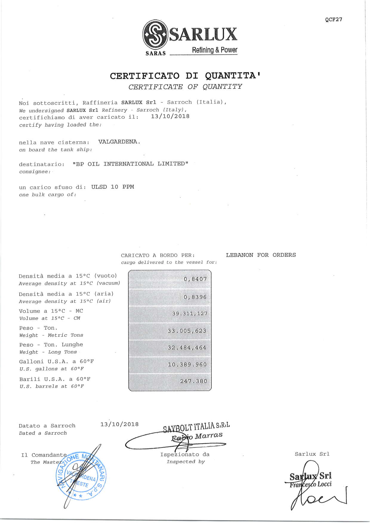 На перевалку надійшло понад 33 тис. т дизельного палива стандарту Євро-5. Виробником ДП є італійська компанія Sarlux, яка управляє НПЗ Sarroch на о. Сицилія потужністю 15 млн т на рік. Постачальником дизпалива виступила BP Oil International Ltd.