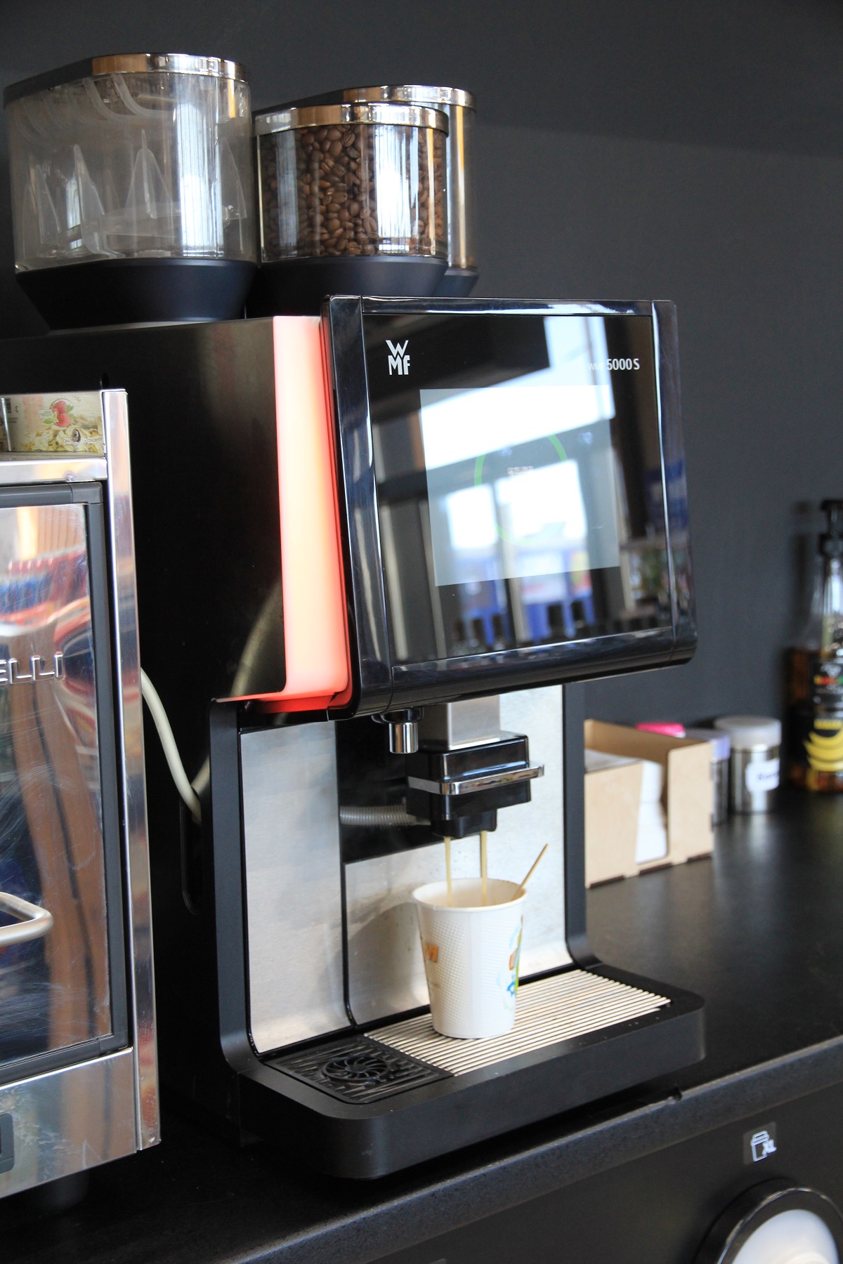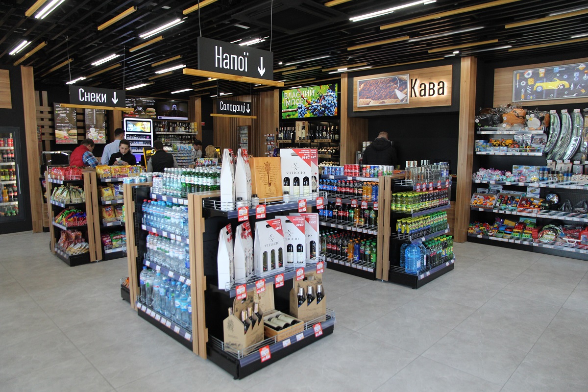 У пристанційному приміщенні розташований магазин і розширене кафе, c кавоваркою WMF 5000S, яка готує 18 видів гарячих і прохолодних напоїв. На АЗС представлений широкий асортимент харчування: хот-доги, гамбургери, паніні та ін. Також на заправці можна придбати вина Viticcio і Cavalli Neri, які ексклюзивно продаються в мережі «БРСМ-Нафта».