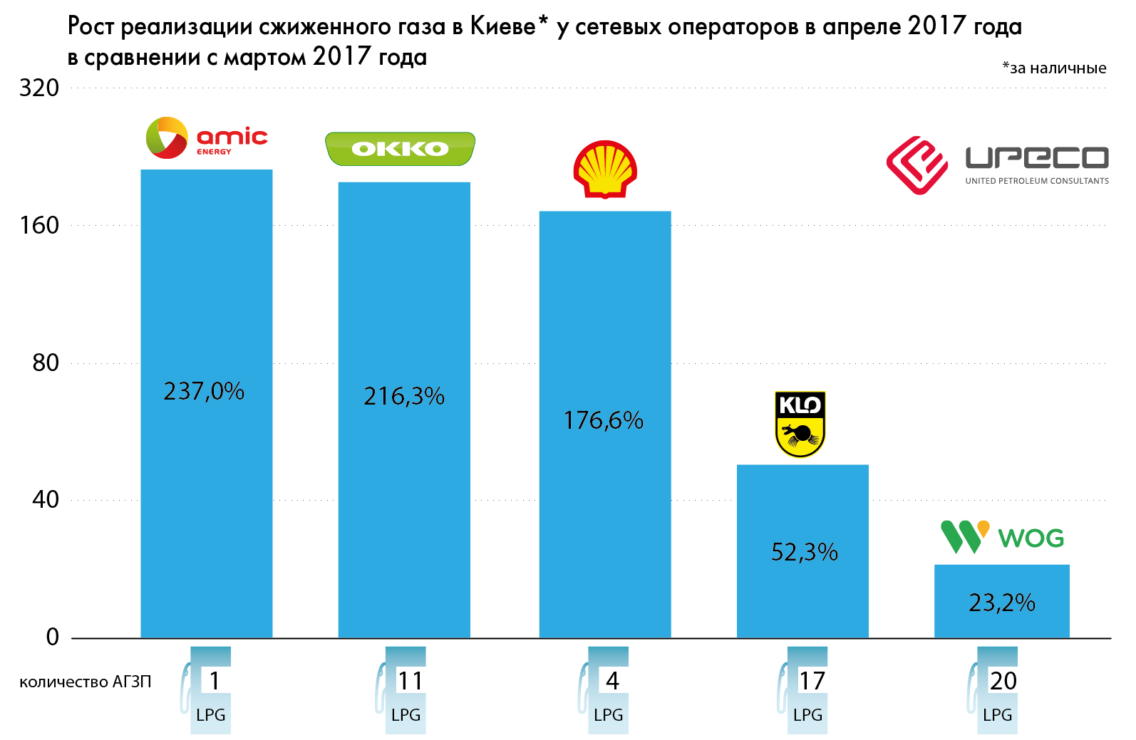 У порівнянні з березнем, у квітні на АЗс мережевих операторів, які залишилися працювати в Києві, зокрема, в членів Нафтогазової асоціації України (ОККО, WOG, SOCAR, AMIC, Shell і KLO), продажі скрапленого газу за готівковий розрахунок показали стрімке зростання на 23, 2-237%, в залежності від кількості станцій.