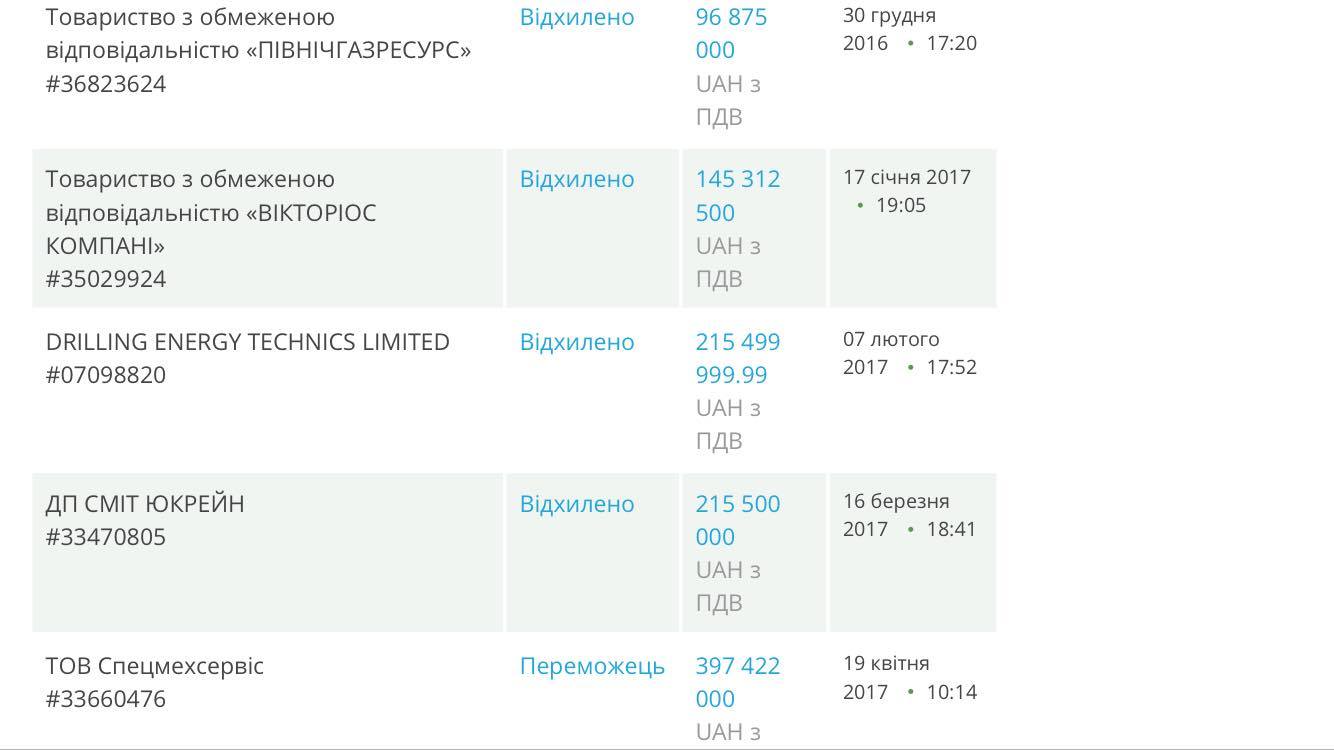 "Спецмехсервіс" подав заявки по 6 лотах, при цьому по іншим 5 лотам пропозиції компанії були відхилені тендерним комітетом "Укргазвидобування" через невідповідність технічним вимогам до предмету закупівлі та / або вимогам до кваліфікації учасників.