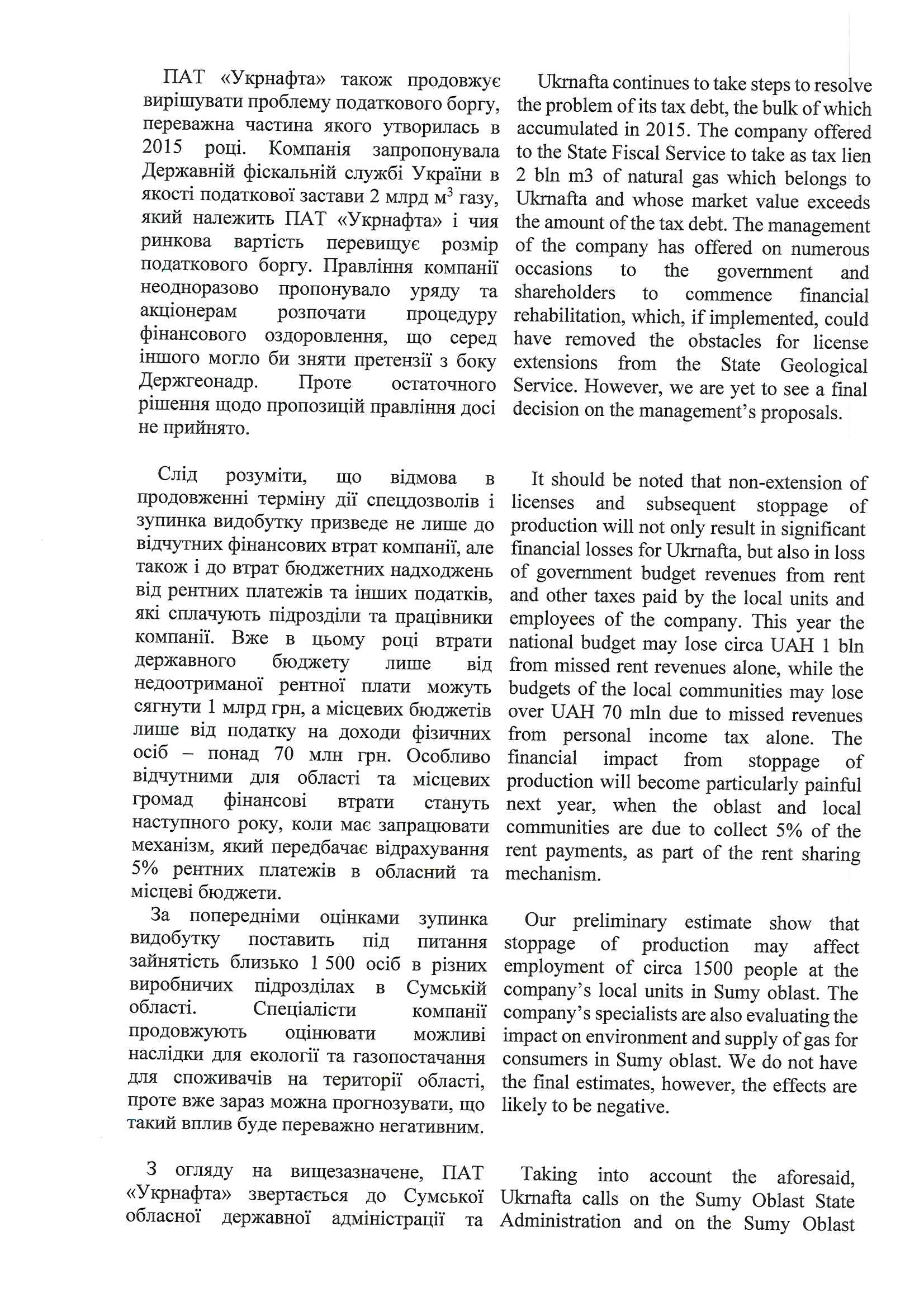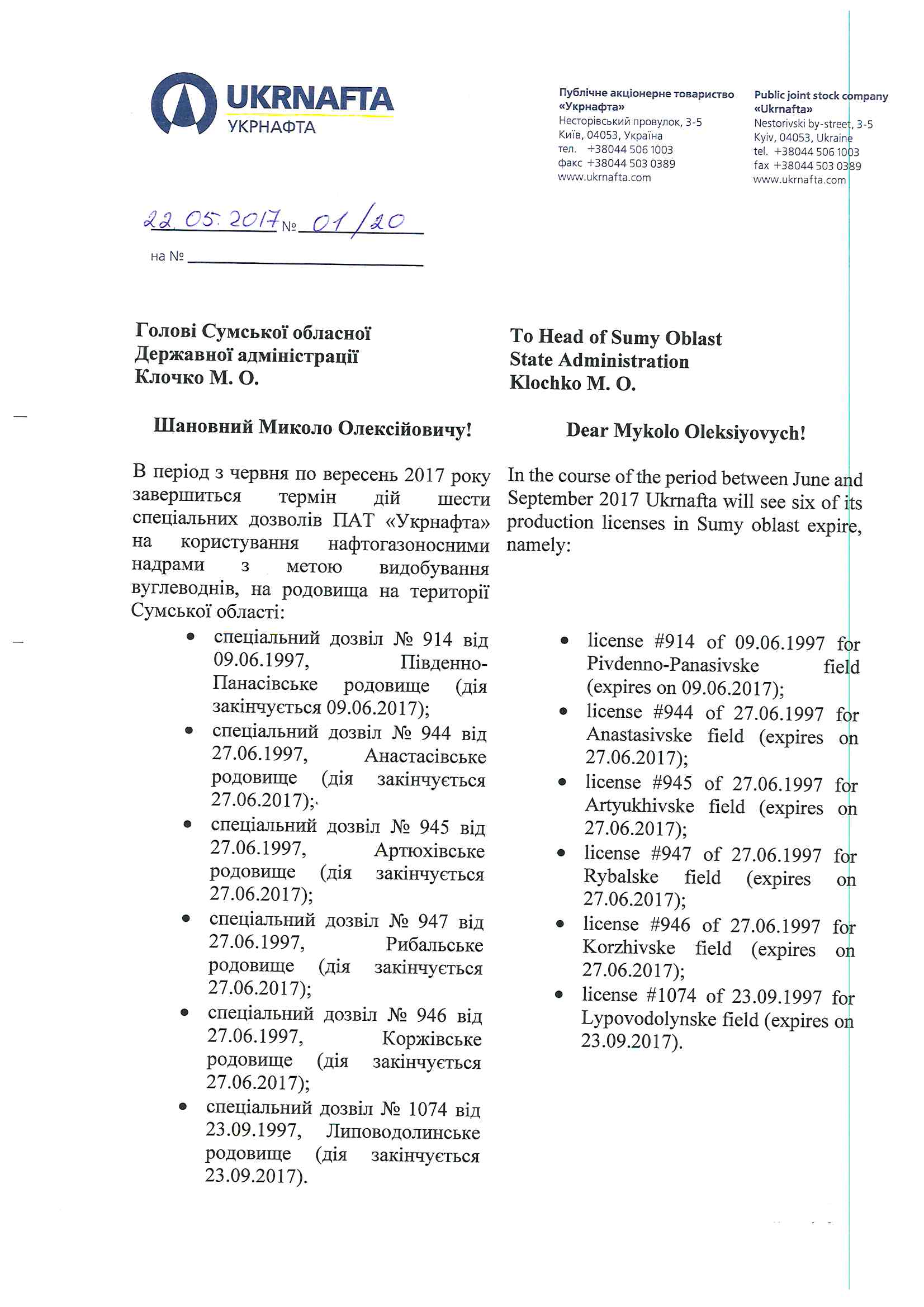 ПАТ «Укрнафта» звернулося до голови Сумської ОДА, з проханням в рамках повноважень глави адміністрації, не допустити зупинки на шести родовищах суспільства, на яких незабаром повинен закінчитись термін дії спеціальних дозволів на видобуток.