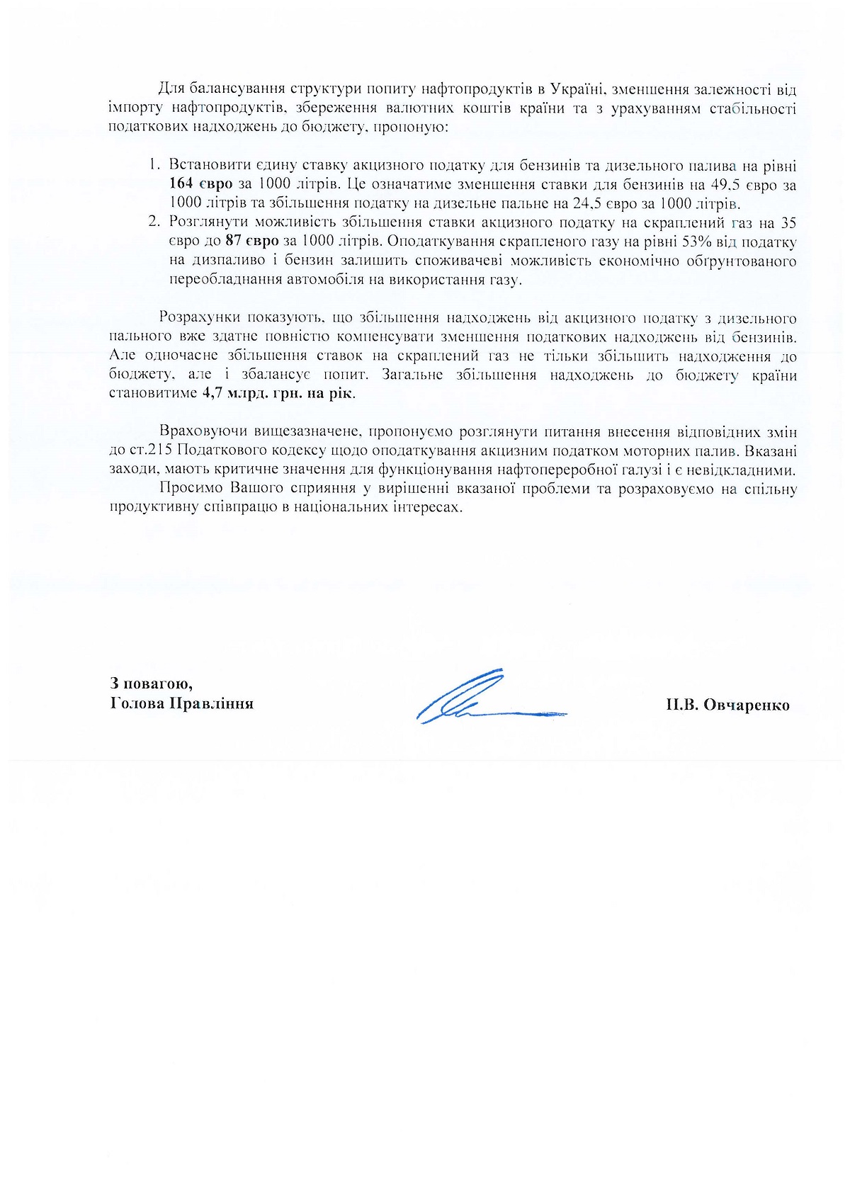 ПАТ «Укртатнафта» (Кременчуцький НПЗ) звернулося з листом до Міністерства економічного розвитку і торгівлі з пропозицією зменшити акциз на бензин і підвищити на дизпаливо і скраплений газ.